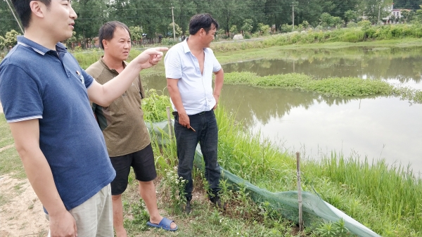 随后冯德祥特派员来到毛集镇李庄村养殖户聂学东的养殖池塘,就出现的倒藻,水位控制等问题进行了讲解。并提出可利用周边小块湿地进行蓄水,避免周边稻田用药期的水质对小龙虾的毒性。