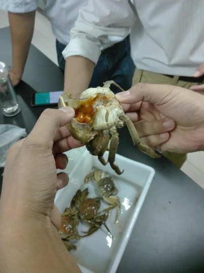 2017年9月19日下午,潢川黄国粮业有限公司水产养殖基地送患病河蟹来水产学院鱼病实验室,希望水产学院为养殖场诊断河蟹病害。水产学院教授级高工郭旭升、高级实验师周本翔、汪成竹副教授、田海军副教授、伦峰老师、黄荣静老师等鱼病专家团队详细调研了池塘河蟹养殖情况,初步诊断为河蟹“水瘪子”病,与养殖场技术顾问针对河蟹病害发生与防治情况进行了详细交流。在交流过程中,水产学院鱼病专家分别对养殖户的养殖模式、苗种来源、水质管理、水草种植、药物使用等均仔细分析,对比各个池塘的差异、与往年的差异等,综合分析原因,并提出部分解决方案,以控制病害的发展。