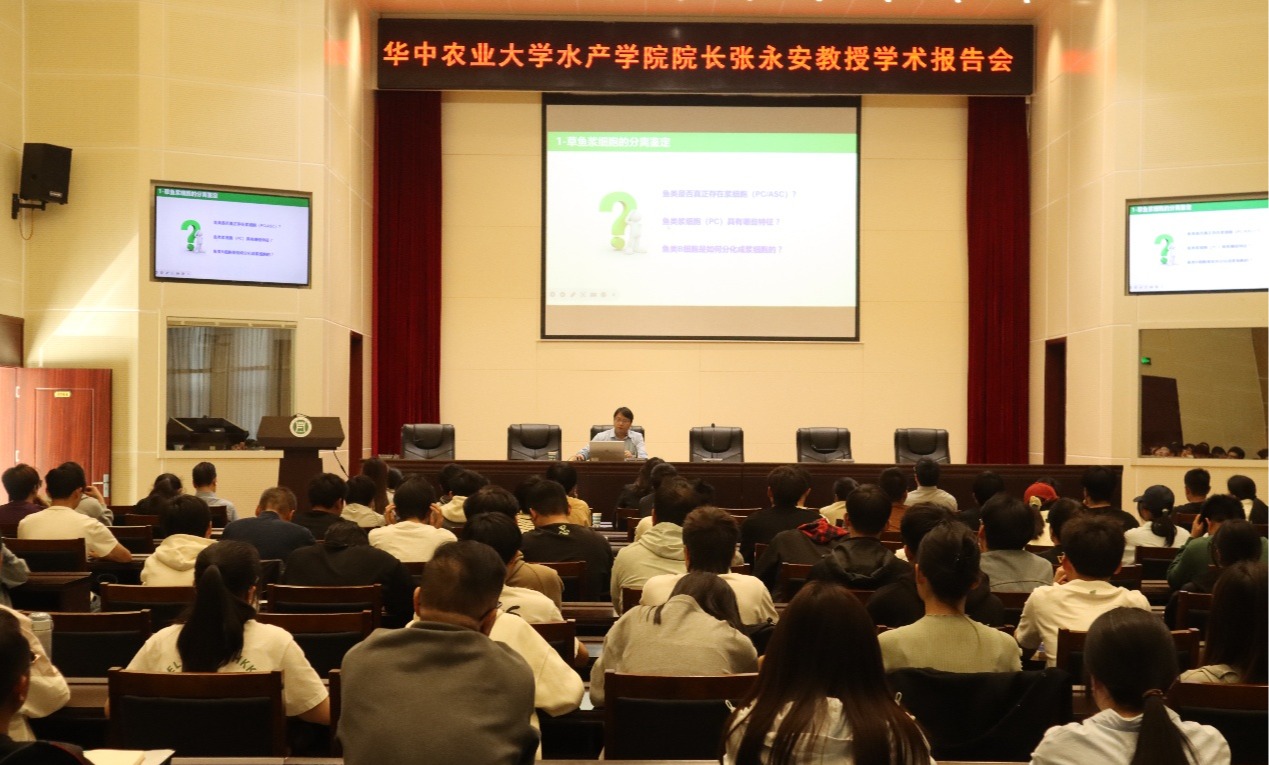 4月15日,应beat365在线平台官网邀请,华中农业大学水产学院院长、国家杰出青年科学基金获得者张永安教授来校进行学术交流,并在图书馆六楼报告厅作了题为《草鱼B细胞的免疫功能和分化路径》的学术报告,水产学院师生两百余人参加了此次报告会。