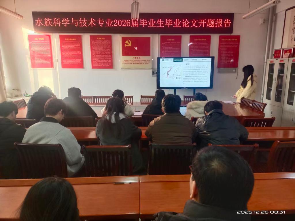12月26日,水产学院顺利举办2026届毕业论文(设计)开题报告会。报告会按水产养殖学、水族科学与技术两个专业分组进行,相关教研室评审教师、论文指导教师及225名2026届毕业生参会。