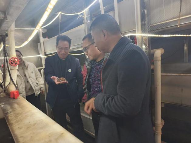 中原水产养殖场是曹畈村龟鳖养殖大户,占地面积近百亩,该场养殖品种丰富,有黄缘闭壳龟、箱龟、侧颈龟、中华鳖等近20个品种,年产值超千万元,养殖模式采用温室与外塘养殖相结合,养殖水平较高,效益较好。服务队成员实地查看了该场龟鳖类养殖情况以及龟鳖的越冬情况,对越冬工作提出了合理建议,并对线上龟鳖交易与养殖户进行了探讨,服务队还就中华鳖养殖种质资源状况与养殖场负责人进行了交流。期间,服务队成员与光山县曹畈村村支部书记吴宏伟进行了对接,介绍了今年科技服务的工作情况,并对2025年该村在水产方面的发展进行了规划。最后,服务队为该村养殖户送上了消毒、肥水等药品。