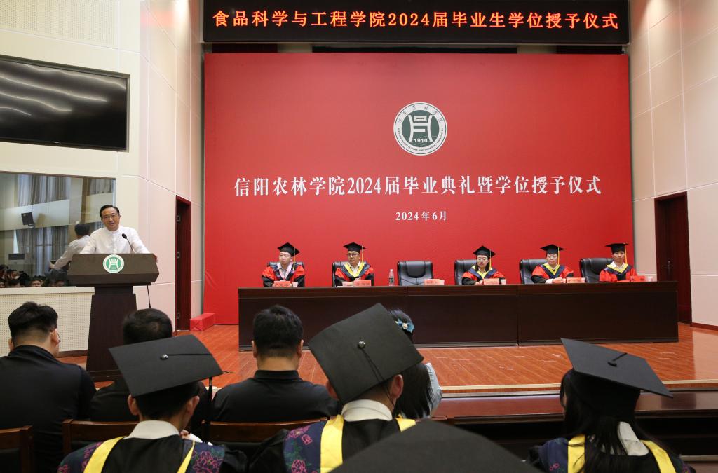 6月7日下午,食品科学与工程学院2024届毕业生毕业典礼暨学士学位授予仪式在图书馆报告厅隆重举行。校党委委员、副校长李益民、学院党总支书记李海祺、学院院长李建芳,党总支副书记严兆洋、副院长王荣荣、副院长朱静,学院学位评定分委员会委员、论文指导老师、辅导员及2024届本科毕业生参加典礼,共同见证了2024届毕业生学有所成、载誉前行的美好时刻。仪式由学院团总支书记易蕾主持。