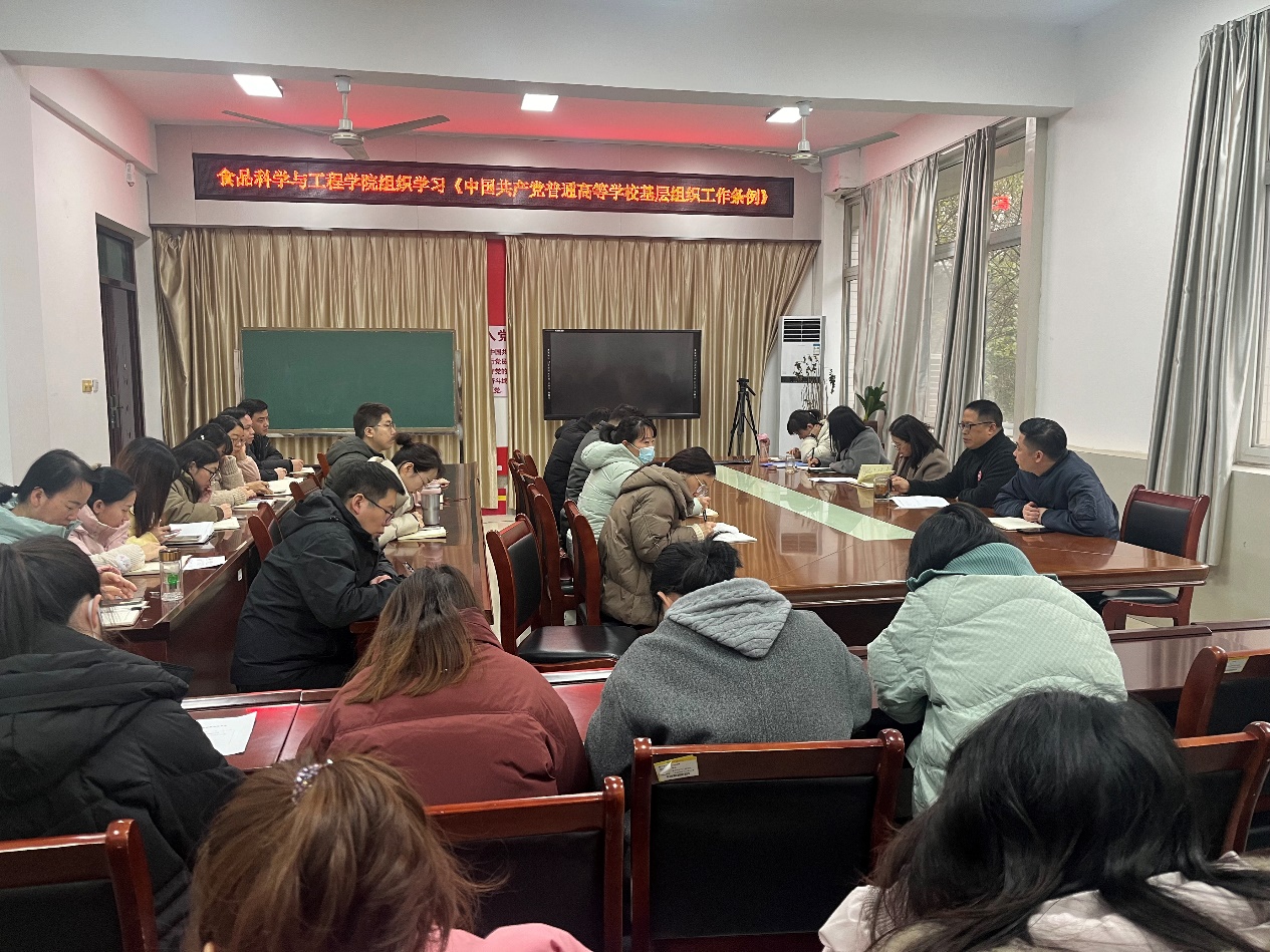 12月10日下午,食品科学与工程学院在科技楼1B206会议室专题学习《中国共产党普通高等学校基层组织工作条例》。学习会由学院党总支书记李海祺主持,学院全体教师党员参加学习。