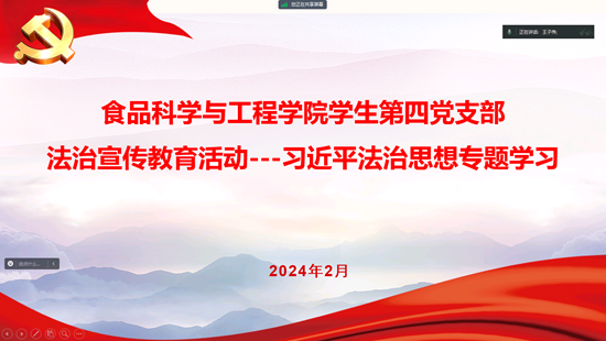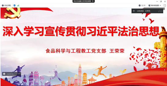 食品科学与工程教工党支部组织全体党员学习党的二十大精神和习近平法治思想,学习《坚守正道:习近平法治思想的鲜明政治品格》、《习近平法治思想中的社会公平正义理论研究》学术论文,学习转发关于习近平法治思想的微信公众号文章。并通过学习强国平台,观看学习关于习近平法治思想的相关节目。