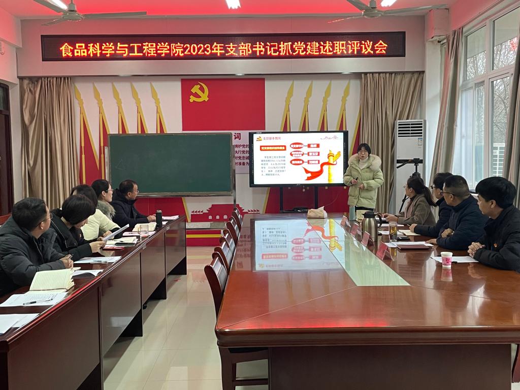 1月18日下午,食品科学与工程学院党总支在科技楼1B206会议室召开党支部书记抓党建述职评议会议。院党总支书记李海祺主持并作总结讲话,院长李建芳、各党支部书记以及党员代表参加会议。会议特别邀请药学院党总支书记魏宗烽、校长办公室副主任刘涛参加评议。