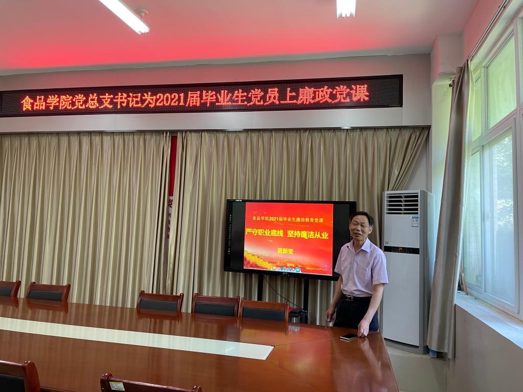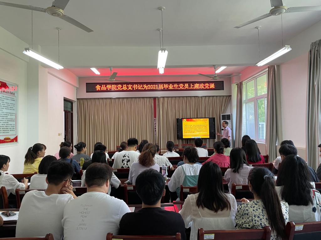 为全面提高广大毕业生的思想政治素质,培养其廉洁自律意识,6月4日上午,食品学院党总支书记夏新奎在实验楼1B206为2021届毕业生党员上廉洁教育党课,全体2021届毕业生党员参加。