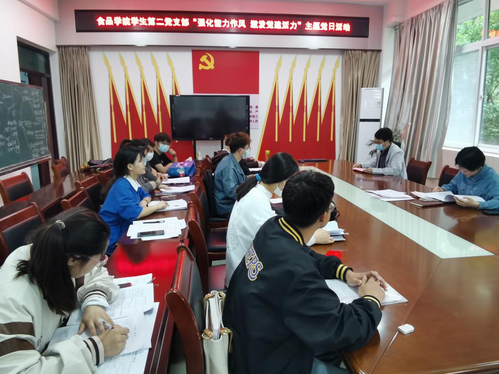 3月29日中午,食品学院学生第二党支部在实验楼1B206会议室组织开展“强化能力作风 激发党建活力”主题党日活动。活动由党支部书记柳诚刚主持,食品学院学生第二党支部全体党员参加。