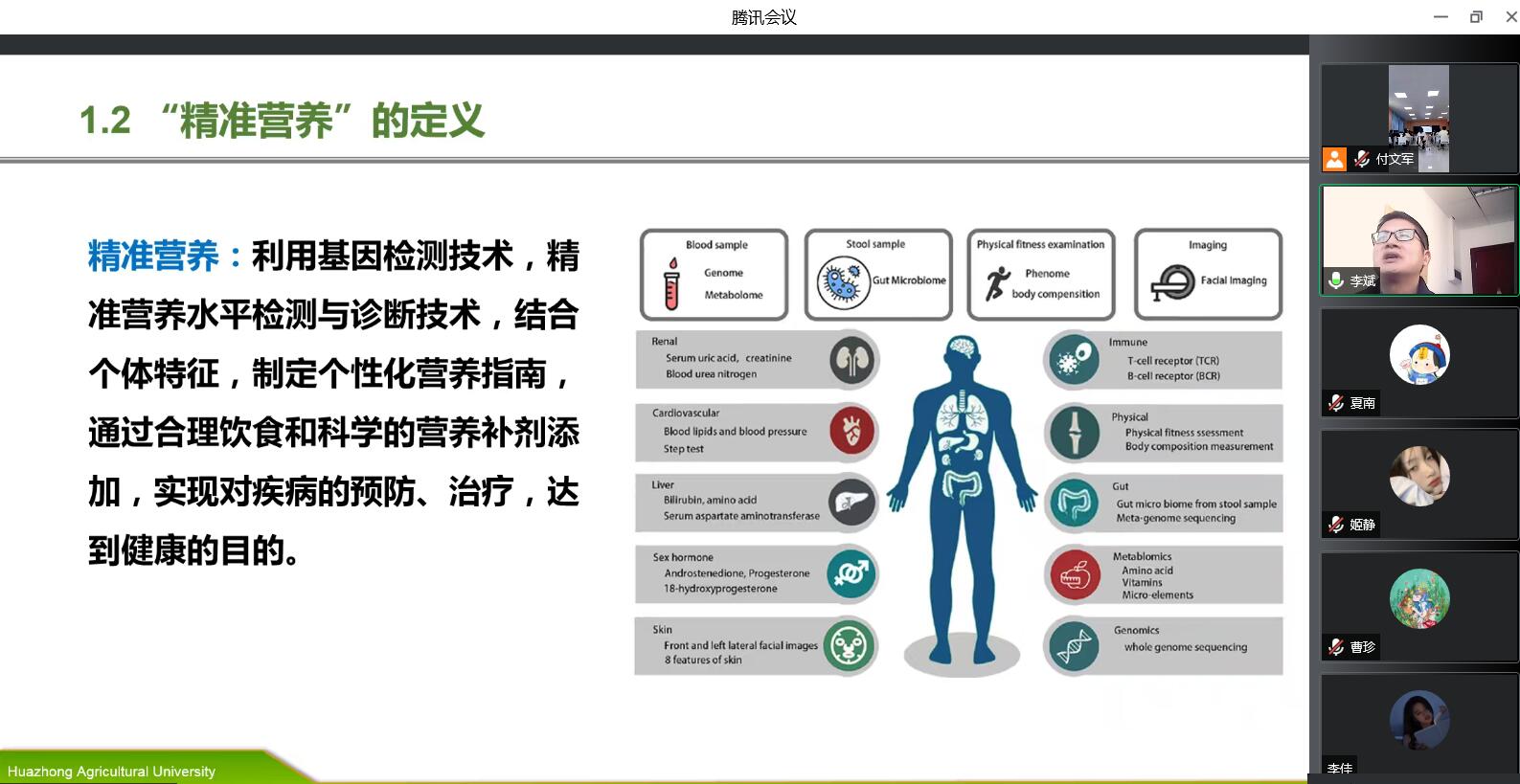 李斌教授的报告主题为“碳水化合物精准营养”,主要介绍了碳水化合物结构、功能及营养特性;碳水化合物的体内消化机制;精准营养的概念及发展历史;通过一些例子对肥胖超重问题做出解释,同时还讲述了测试餐的理化性质,受试者的主观食欲及随意餐实验。此外,李斌教授还介绍了人体的大多数疾病都是由基因引起的,基因序列的差异通过人体内组成成分的功能差异引起疾病的发生。通过基因解码解读个体基因信息的差异,根据基因信息调节饮食结果和营养元素的组成,可以实现预防疾病、治疗疾病的目的。通过精准营养进行防病、治病,可以从根本上消除或减少并症后遗症。最后李斌教授介绍了所在团队近几年取得的科研成果,并鼓励在座的同学们积极报考华中农业大学食品学院的研究生。