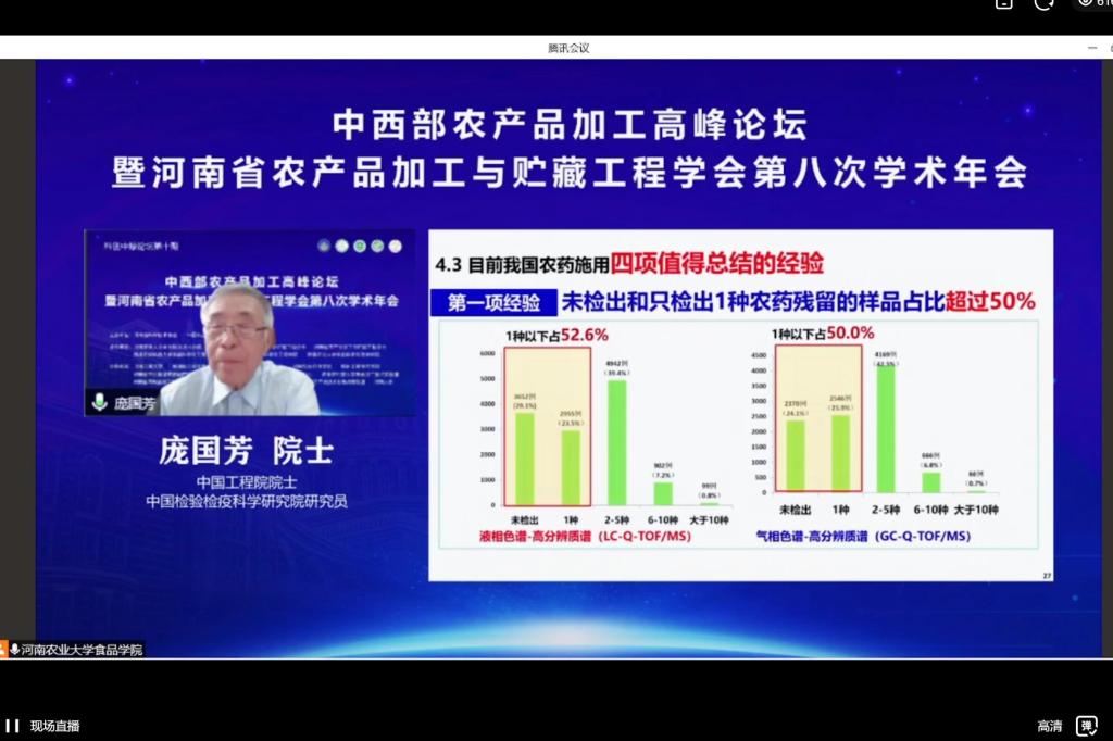中国工程院庞国芳、孙宝国、朱蓓薇、吴清平四位院士及来自国内外的42名知名专家学者进行了学术报告交流,线上线下近两万人次参会。大会围绕“中西部农产品加工贮藏发展战略与产业转移、特色农产品高值化利用、农产品精深加工及农产品贮藏新技术与装备、农产品精深加工工程技术与装备、农产品质量安全与溯源技术与装备、农产品生物加工工程技术与装备、速冻食品加工技术工程与装备、农产品营养与健康、农产品功效与生物活性成分”等9个议题展开深度研讨,突出“农产品加工与贮藏行业卡脖子问题的科技创新与实践”的特色,充分探讨河南乃至全国农产品加工与贮藏行业的科技创新成果及未来发展。