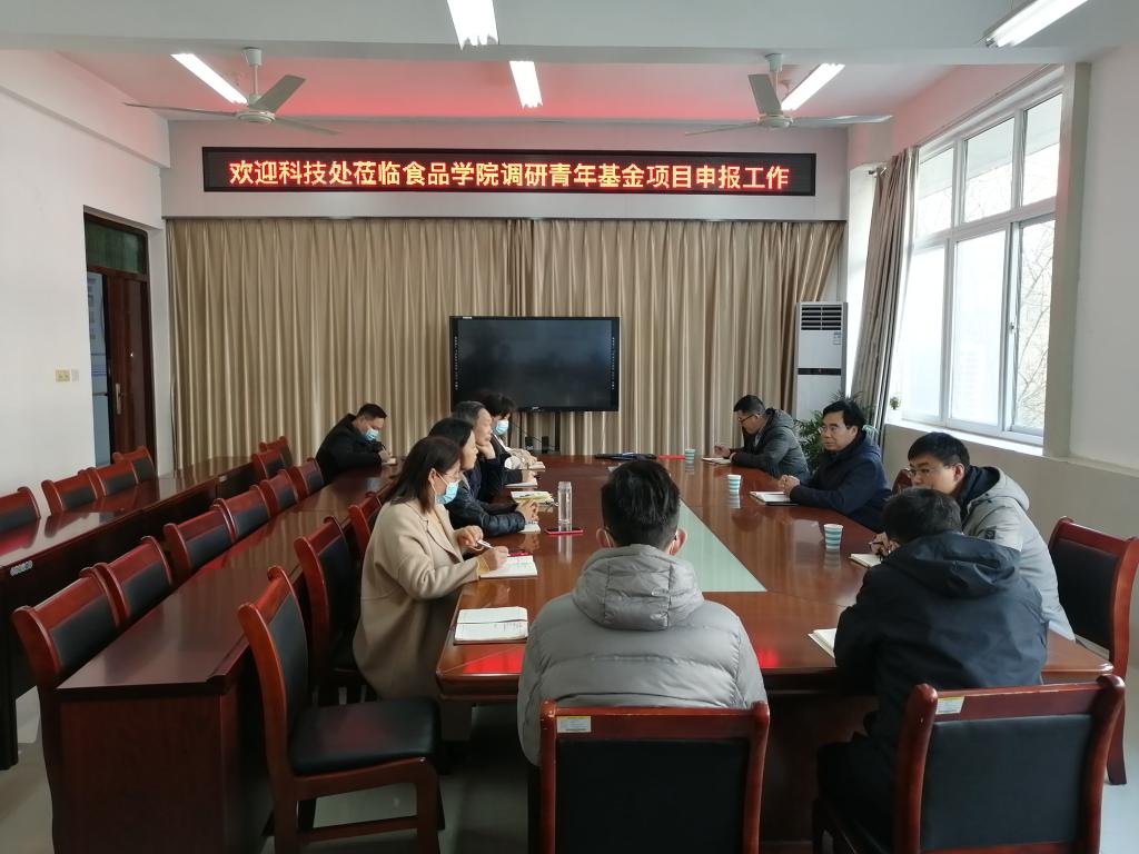 2月24日上午,科技处史洪中处长、吴海港副处长和付满意老师一行3人来到食品学院调研国家自然科学基金项目申报工作,食品学院邢淑婕院长、夏新奎书记、李建芳副院长及部分博士教师参加了会议。