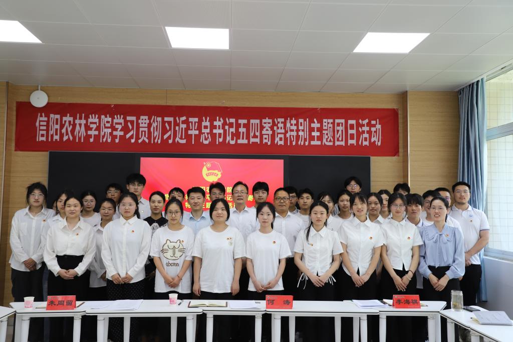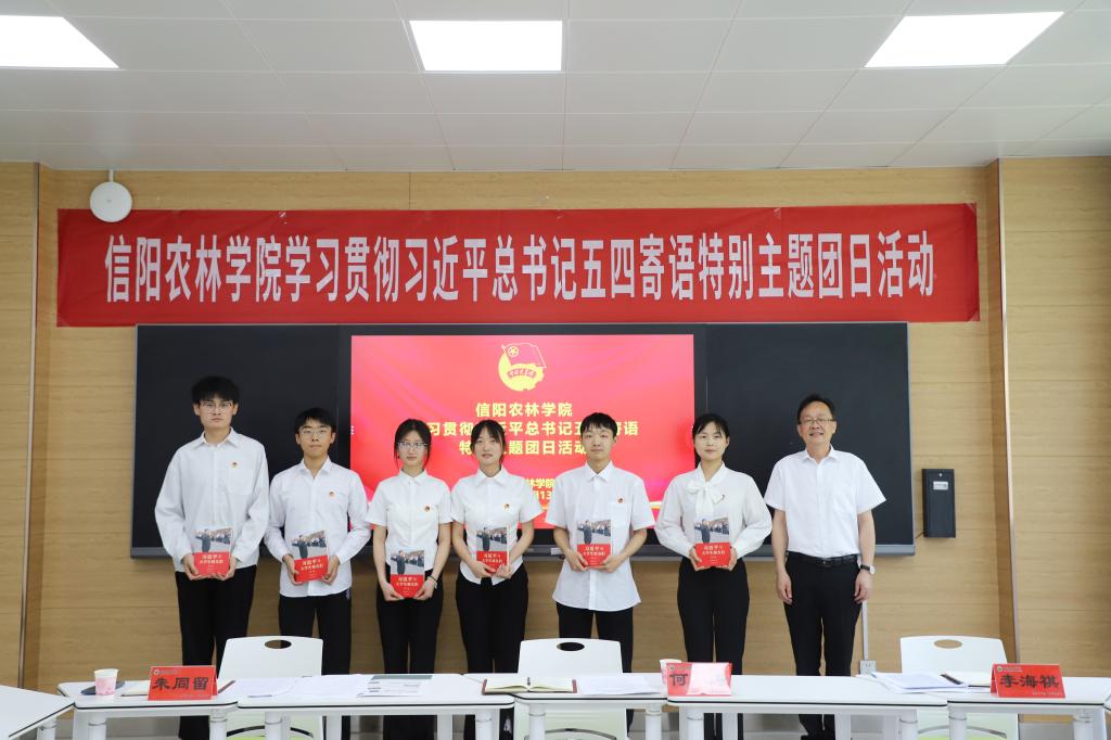 何涛与同学们亲切交流,共同庆祝青年人的节日。他赞扬了支部同学们积极昂扬的精神面貌,为同学们阐释了五四精神的核心要义,生动讲述了学校发展中的故事,并对全体团员青年提出四点希望:一是要树立远大理想。要发扬五四精神,高擎理想的火炬,从内心深处厚植对党的信赖、对中国特色社会主义的信心、对马克思主义的信仰,将个人理想与国家命运紧密结合在一起,在奉献社会、服务人民中实现青春梦想。二是要担当时代重任。要积极投身学校学雷锋、乡村振兴等一系列活动中,在融入活动、融入校园、融入社会中不断锤炼个人素质,提升个人能力,为将来在更广阔天地中施展自身才华打下坚实基础。三是要练就过硬本领。要通过不断的学习和实践练就过硬的核心本领,不断在时代变化中提升应对各种困难挑战的素质和能力,积极运用所学本领投身于中国特色社会主义的伟大实践,以过硬本领贡献国家、服务人民。四是要勇于砥砺奋斗。要切实担负起时代赋予的责任和使命,把家国情怀落实到具体行动中,在担当中作为,在磨砺中成长,走稳人生第一步,扣好人生第一粒扣子,在信阳这片热土上书写属于信阳林学院的崭新时代篇章。活动尾声,何涛为支部团员代表赠送《习近平与大学生朋友们》(第二卷)。