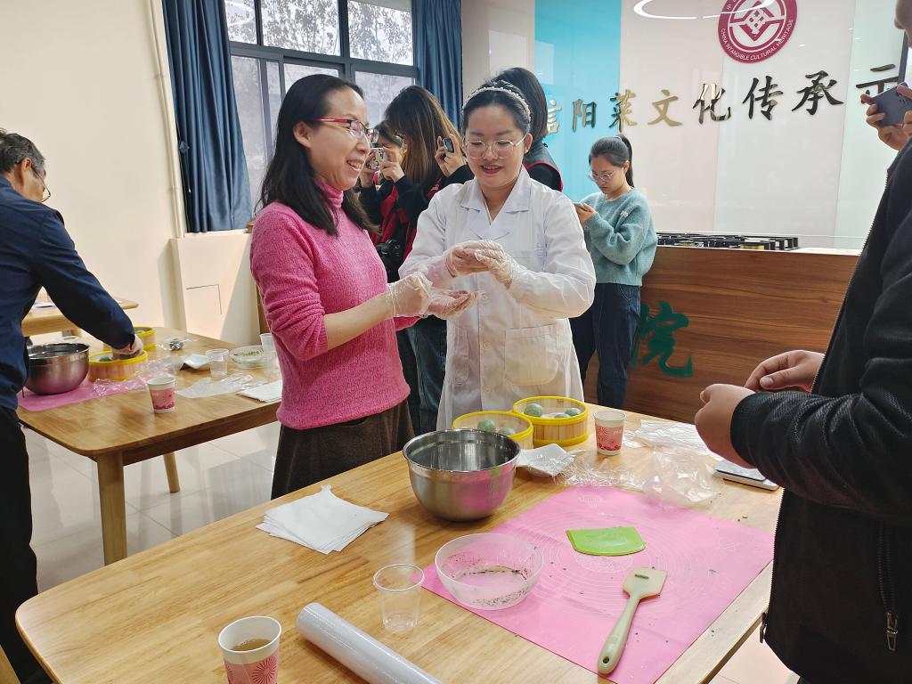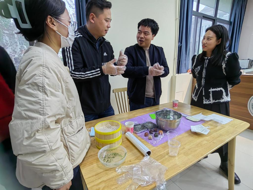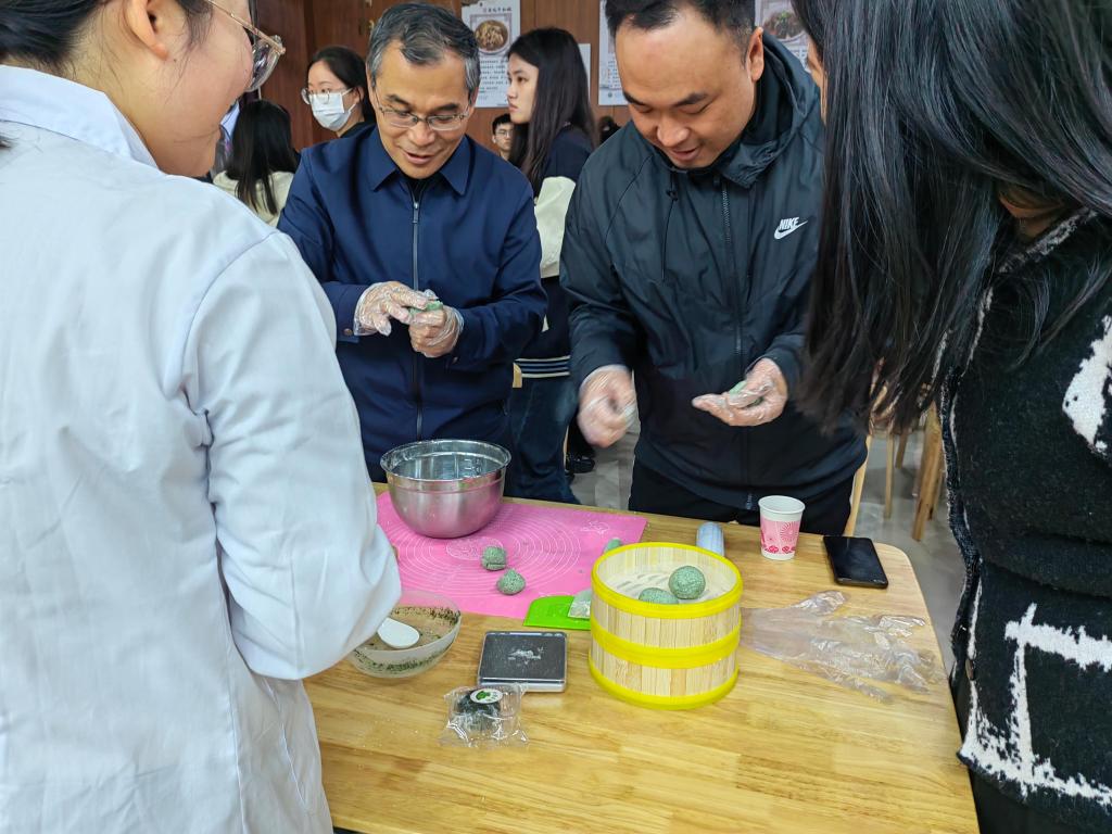 作为清明节前后一道极具特色的美食,青团所传递的不仅仅是一种美味,更是一种对传统文化和历史的呼唤。活动中,在食品学院王雪菲老师的带领下,师生们大显身手,捻青、和粉,揉粉、裹馅,亲手制作传统美食青团,沉浸式体验中华优秀传统文化。