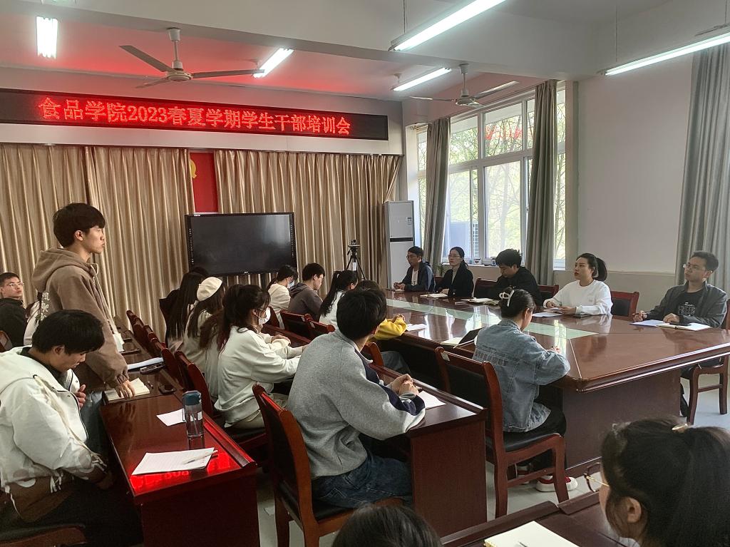 为深入学习宣传贯彻党的二十大精神,进一步加强学生干部队伍建设,提高学生自我服务、自我管理、自我教育、自我监督的意识和能力,3月14日中午,食品学院在1B206会议室召开2023年春夏学期学生干部培训会,院党总支副书记刘涛,学工组老师以及全体学生干部参会。