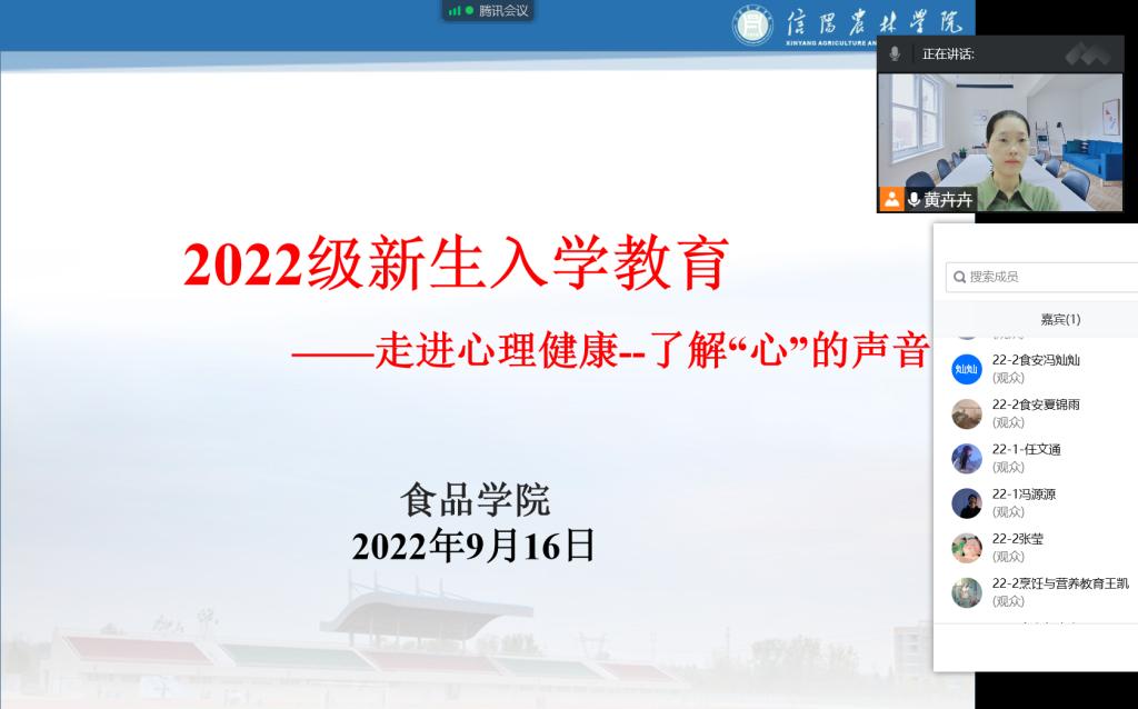 为帮助新生了解心理健康相关知识,以良好的心态投入到大学学习和生活,9月16日上午,食品学院心理专员黄卉卉老师为2022级新生做了题为《走进心理健康——了解“心”的声音》线上心理健康教育讲座。