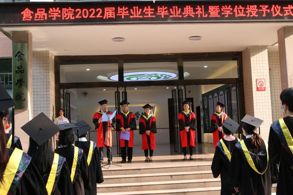 5月23日下午,食品学院2022届本科毕业生学士学位授予仪式在1B科技楼前隆重举行。院领导班子成员、各教研室教师代表以及学院2022届本科毕业生参加了仪式。仪式由院党总支副书记刘涛主持。