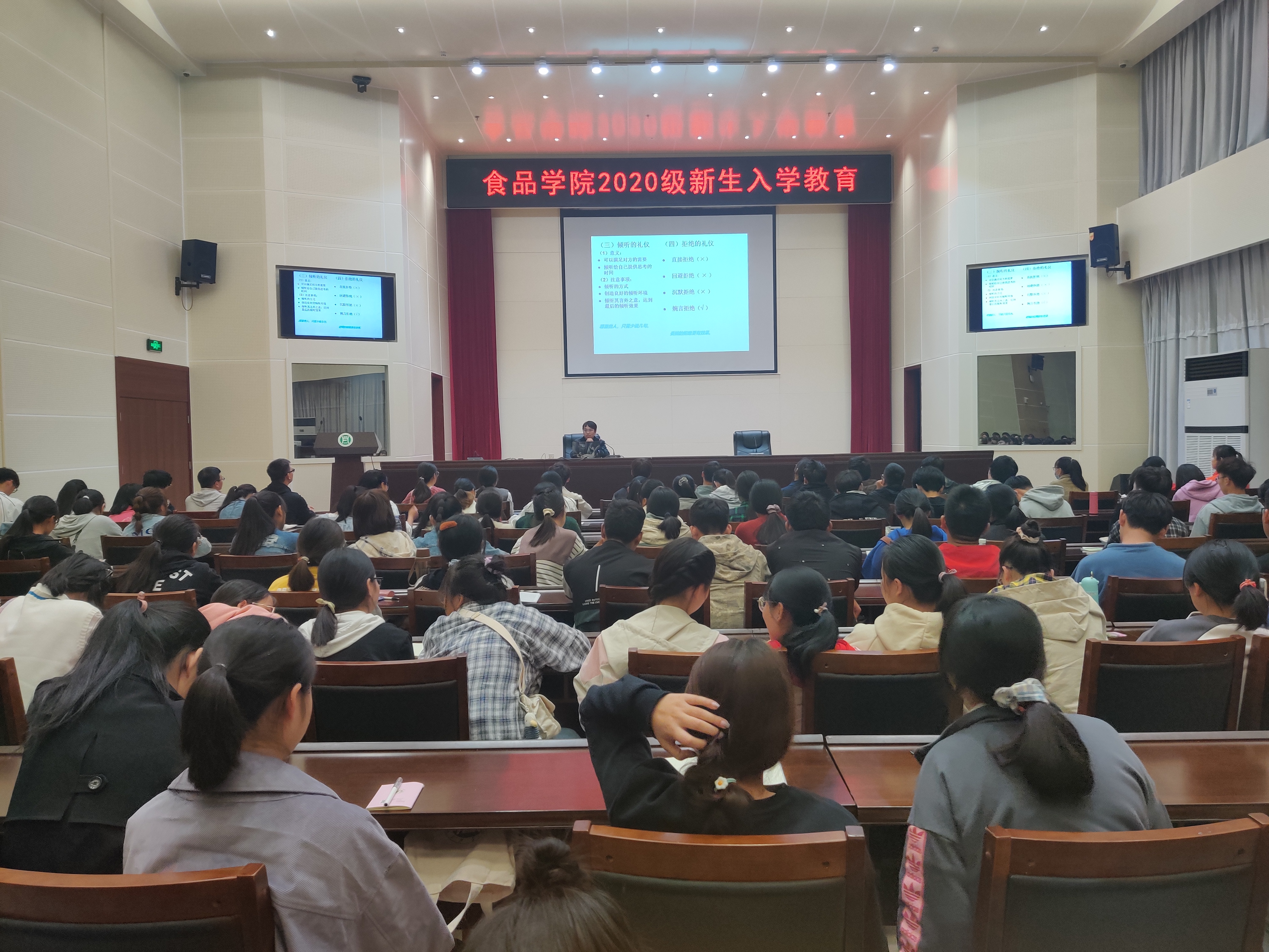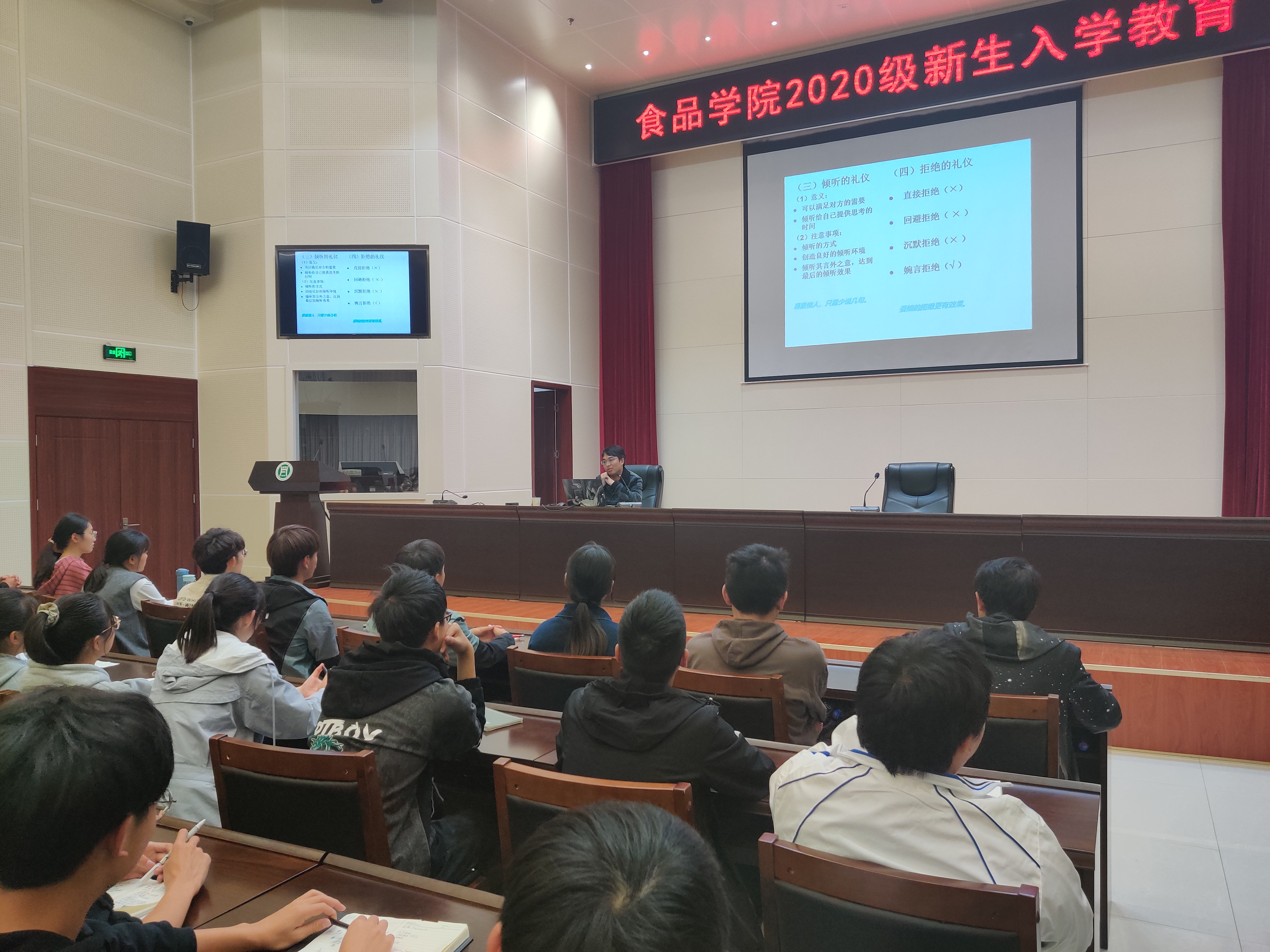 2020年10月23日晚,食品学院在图书馆六楼报告厅开展了食品学院2020级新生入学教育之文明礼仪行为教育和法律意识教育,讲座由学院专职辅导员柳诚刚老师主讲,全体2020级新生聆听了报告。