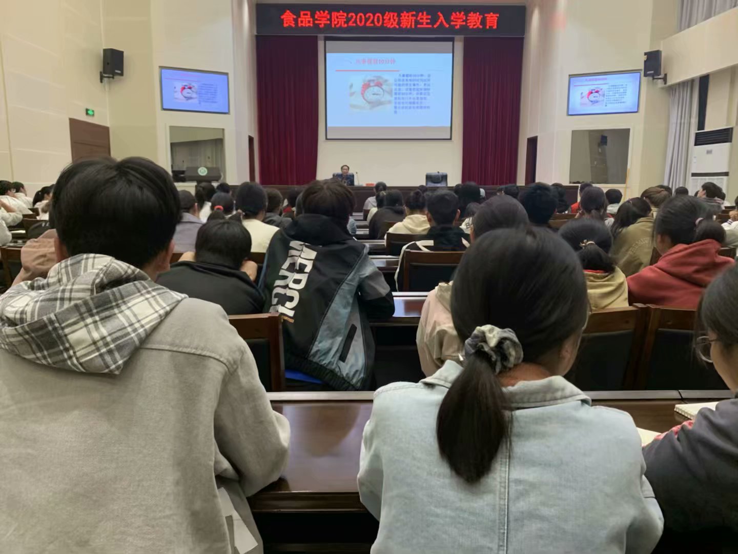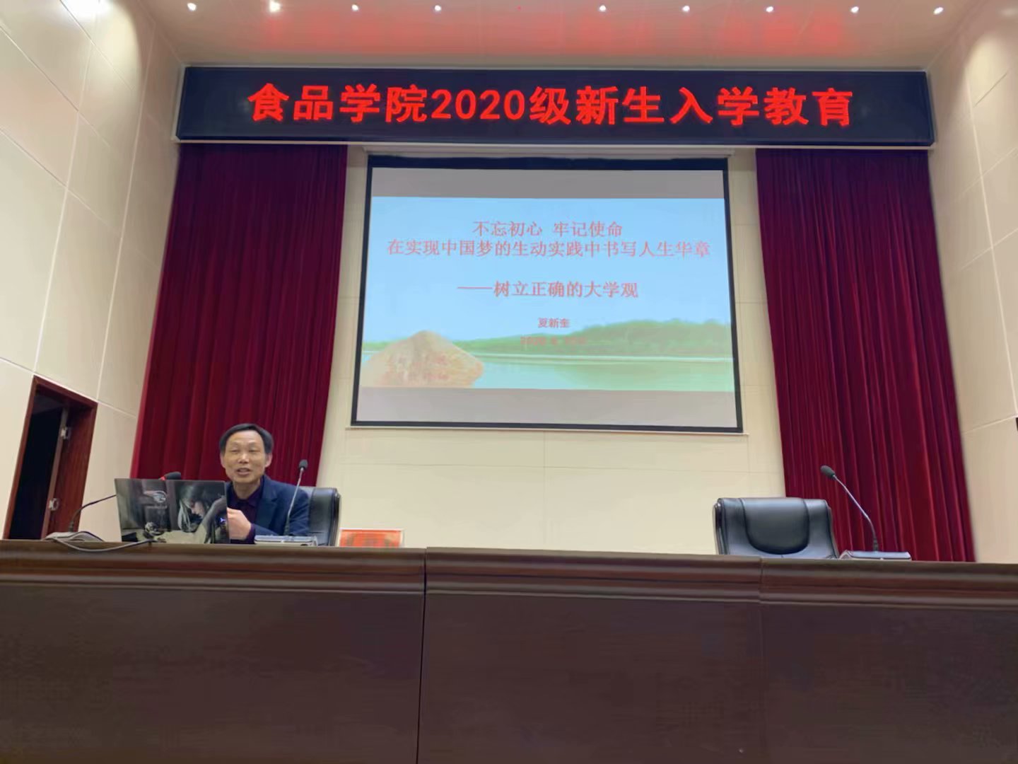 10月20日晚,为加快食品学院2020级新生适应大学生活,做好角色转变,食品学院党总支书记夏新奎于图书馆6楼报告厅做关于《不忘初心 牢记使命 在实现中国梦的生动实践中书写人生华章——树立正确的大学观》的主题报告会,食品学院党总支副书记刘涛、食品学院团总支书记易蕾、新生辅导员柳诚刚、新生辅导员曹蒙、新生辅导员刘海波、新生辅导员靳羽慧及全体大一新生聆听了报告。