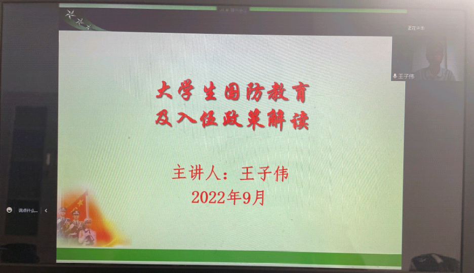 为了增强2022级学生的国防观念和国家安全意识,厚植其爱党爱国爱社会主义的情感,9月13日下午,食品学院在线开展“大学生国防教育及入伍政策解读”报告会。会议由食品学院武装专干王子伟老师主讲,食品学院2022级全体新生参加。
