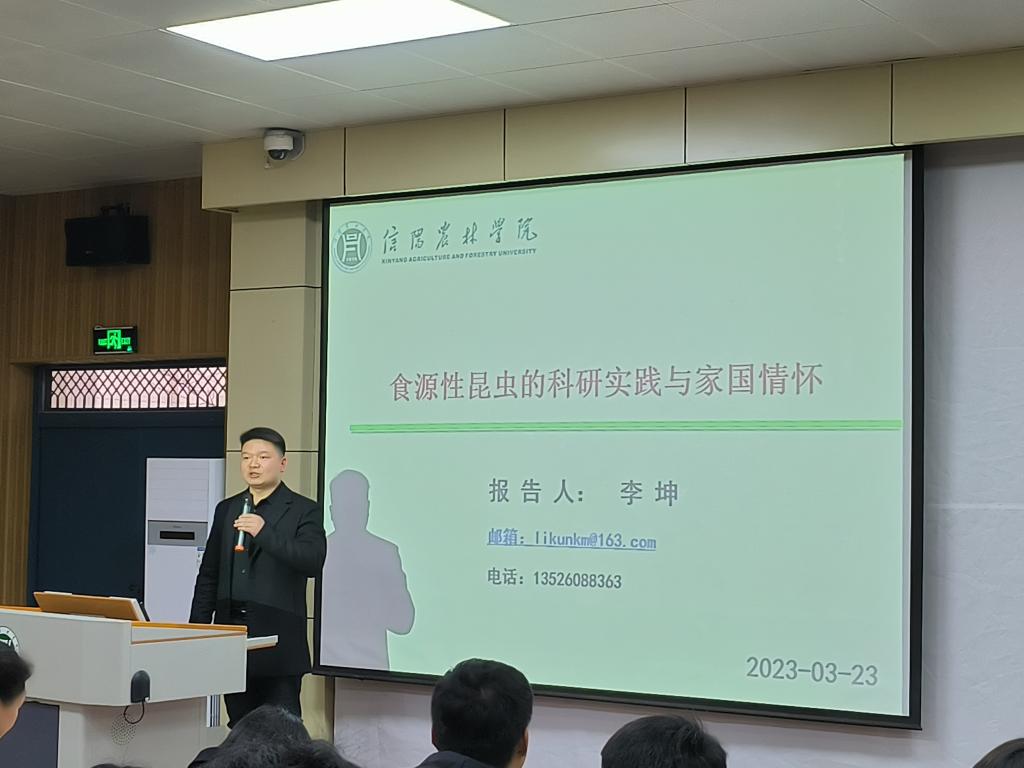 为认真学习贯彻党的二十大精神,落实立德树人根本任务,深入推进学校“三全育人”工作,引领学生以强农兴农为己任,beat365在线平台官网“三全育人”大讲堂第八讲“食源性昆虫的科研实践与家国情怀”于3月23日下午在二教204举行。主讲人食品学院副教授李坤博士为全校师生带来了一场别开生面的精彩讲座,校党委办公室副主任熊元靖、校党委宣传部副部长朱同留、教务处副处长唐芳、科技处副处长吴海港、校党委学工部副部长孙莉琴、水产学院党总支副书记黄光玲、工商管理学院副书记王宇平、食品学院党总支副书记刘涛和beat365在线平台官网部分师生参加了讲座。讲座由食品学院团总支书记易蕾主持。