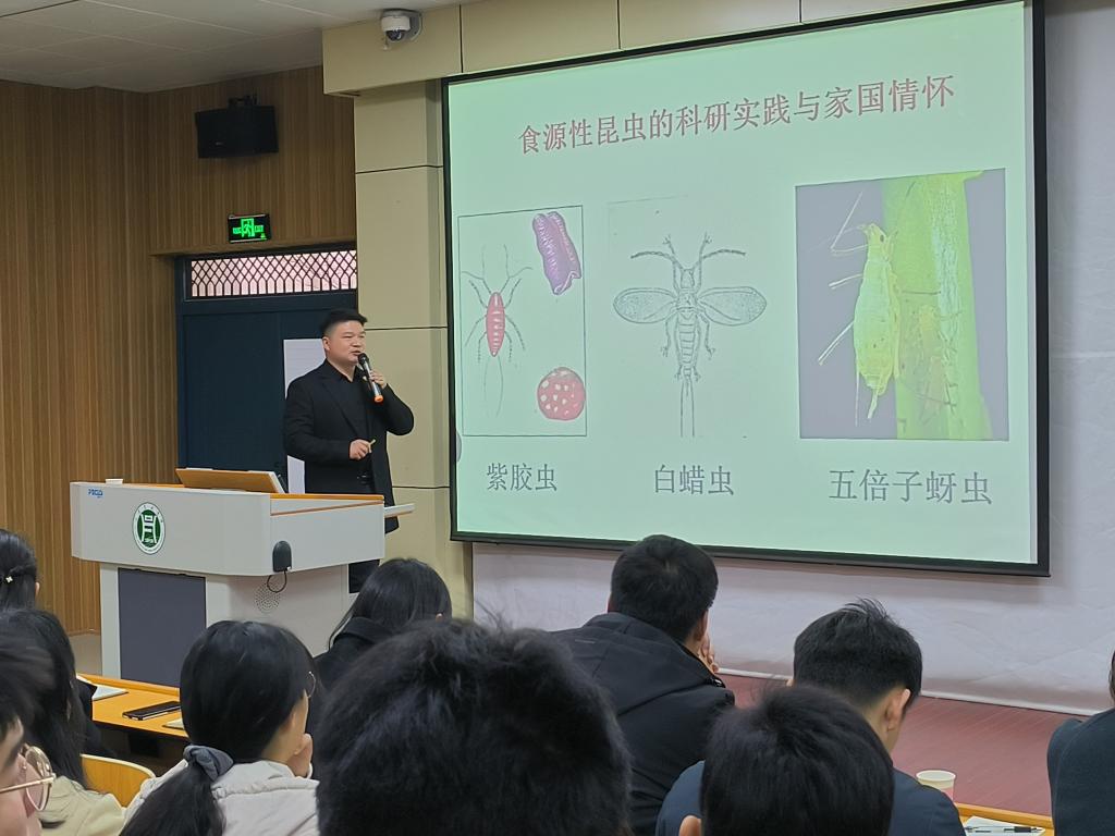 本次讲座中李坤博士结合自己的科研经历,从国家与单位,个人与集体等多个角度阐释了食源性昆虫与国家发展、百姓生活之间的密切联系,详细从紫胶虫、白蜡虫和五倍子蚜虫三种食源性昆虫及其附属产物在食品、药品和保健品等领域的产品开发和应用的角度,深入介绍了三种昆虫与国家战略和社会发展之间的内在联系,同时介绍了自己及所在团队的科研成果,并展望了未来个人与本校和地方特色结合的科研方向,与大家分享了科研服务国家、地方和产业发展的思路和想法。