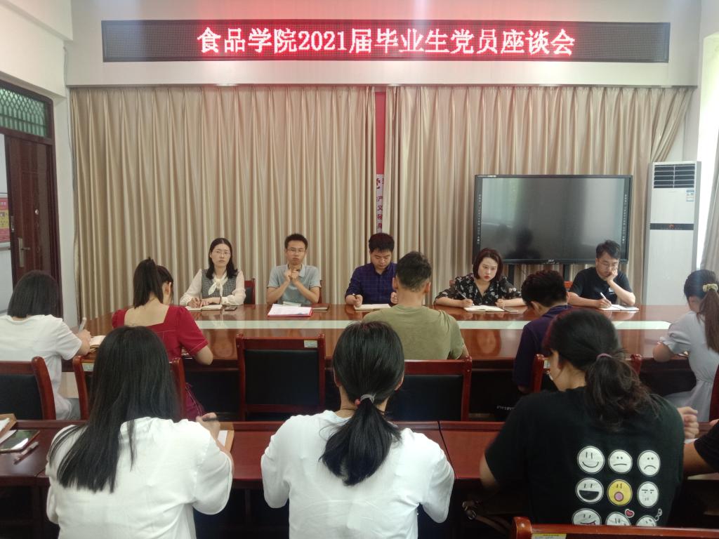 为充分肯定毕业生党员在校几年以来所做出的各种努力,进一步激发他们在走向社会后永葆共产党员先进性,为社会做出更大的积极贡献,6月2日,食品学院在1B206召开了2021届毕业生党员座谈会。食品学院党总支副书记刘涛、团总支书记易蕾、组织员王子伟、专职辅导员黄卉卉、专职辅导员柳诚刚以及2021届毕业生党员参加本次座谈会。