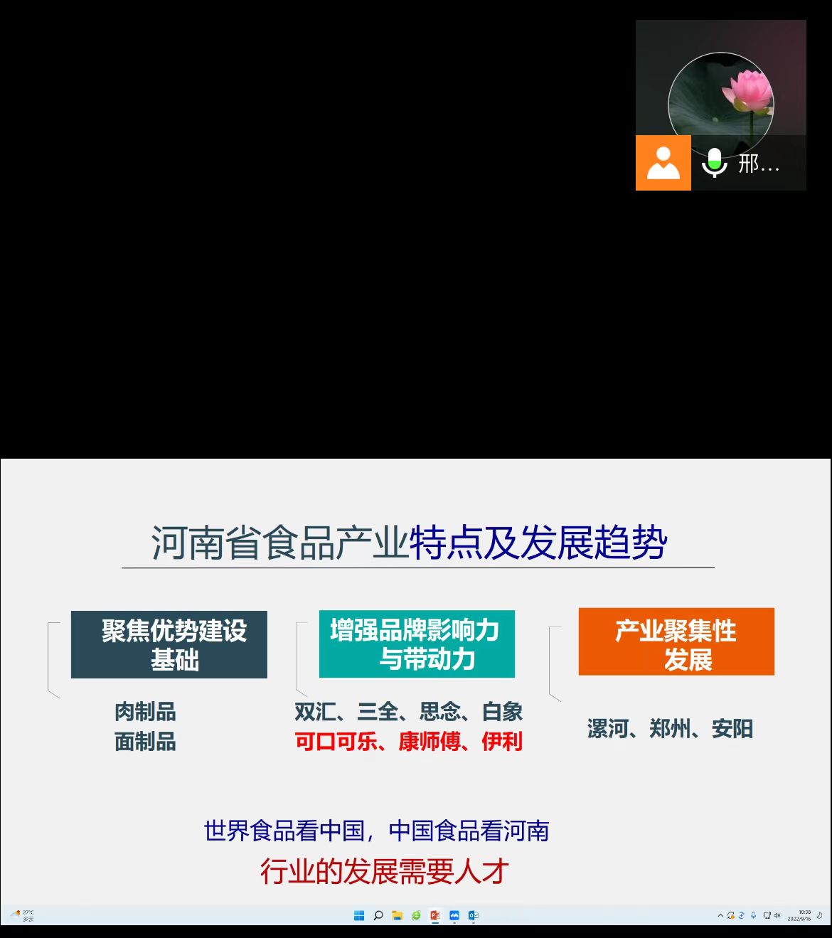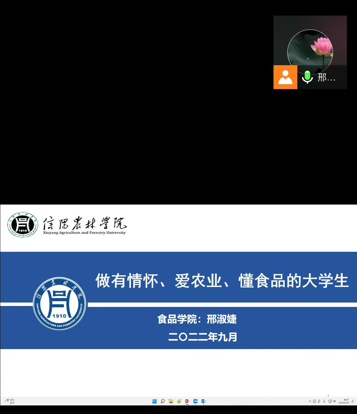 2022年9月16日上午,食品学院院长邢淑婕教授通过腾讯会议平台为2022级新生做了题为《做有情怀爱农业懂食品的大学生》新生入学教育之“大国三农”专题报告。