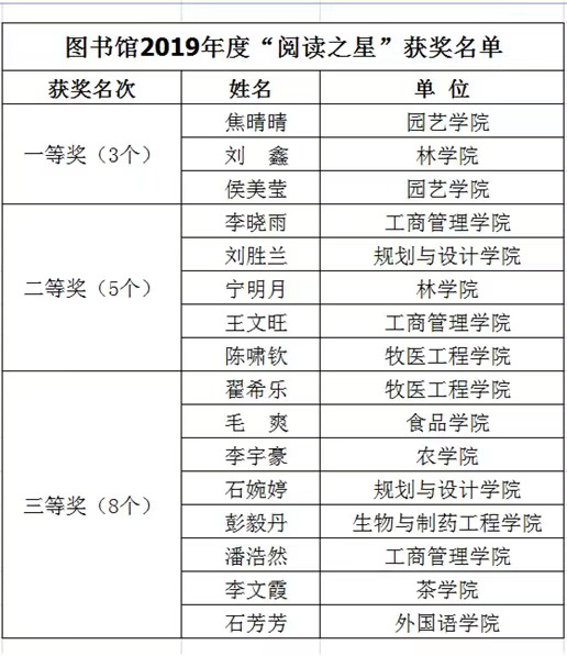 为营造良好的校园学习氛围,引导广大师生求知阅读,依托本次“书香信农·阅读人生”读书月活动,图书馆评选出2019年1月1日至12月31日借阅量前16名的读者,给他们颁发“阅读之星”称号,下面公布获奖名单: