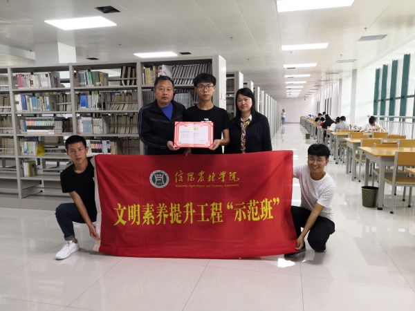 5月21日上午,茶学院文明“示范班”——茶学(茶文化与营销)2018班,在图书馆社科书库(1)接受表彰,该班部分学生与图书馆副馆长刘明和流通部主任徐玉梅合影留念。图书馆为该班颁发了荣誉证书,肯定了他们在图书馆书库志愿服务活动中取得的业绩,鼓励他们在今后的工作中再接再厉,勇创佳绩。