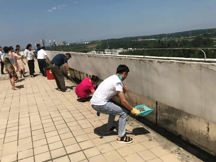 会后,馆领导带领各位部主任从负一楼巡查到五楼,逐一排查书库、阅览室、过刊室、自习室、开水间的安全隐患,并带领部分教职工来到六楼顶层,一同疏通清理雨水排水口堵塞物及丢弃的各种垃圾,以避免汛期暴雨造成水患。(图书馆)