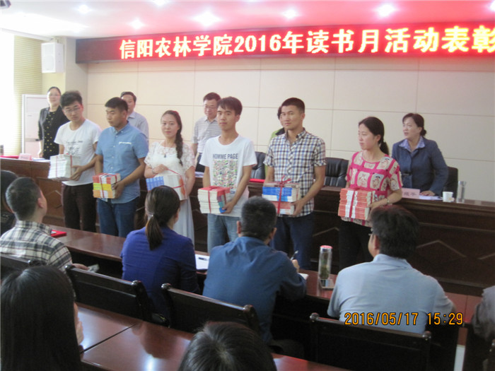 会上,校工会副主席宋建军首先宣读了“关于表彰2016年读书征文活动获奖文章的决定”。接着,学校领导及工会、图书馆、团委负责同志向获得教工团体组织奖的工商管理学院分会、林学院分会、图书馆分会、党群分会和获得学生团体组织奖的茶学院团总支、牧医工程学院团总支授予荣誉匾额,向本次获得征文一、二、三等奖的作者颁发了荣誉证书并进行读书经验交流,征文获奖者王海燕老师、徐玉梅老师、陈颖同学等获奖代表畅谈了读书感悟,师生分享了精彩的阅读心得。表彰会上,图书馆向团委学生捐赠图书100册。