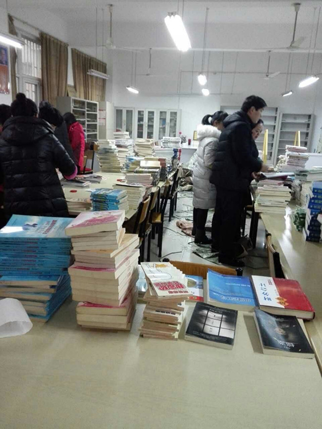 2016年随着招生人数的增加,上级要求在校生生均递增3册图书,由于经费紧张,当年未能达到购书数量,为避免影响beat365在线平台官网本科合格评估检查,图书馆积极想办法、抢时间,于2016年12月20日—21日在馆长刘继平、支部副书记郭淑红、副馆长刘明的带领下,冒着严寒和大雨,把存放在科技楼捐赠的3000册图书,用6位馆员的私家车一趟趟的拉到2B实验楼分馆,大家心往一处想,劲往一处使,不怕苦、不怕累,不怕灰尘,加班加点,扛包、分类、编目、贴条形码和防盗磁条,录入数据库。很多人带病和牺牲调休时间,克服了没有打号机与打书标机的困难,用手填写书标号,完成了2016年在校生生均递增3册图书的任务,使beat365在线平台官网2016年图书递增量达到38328册。