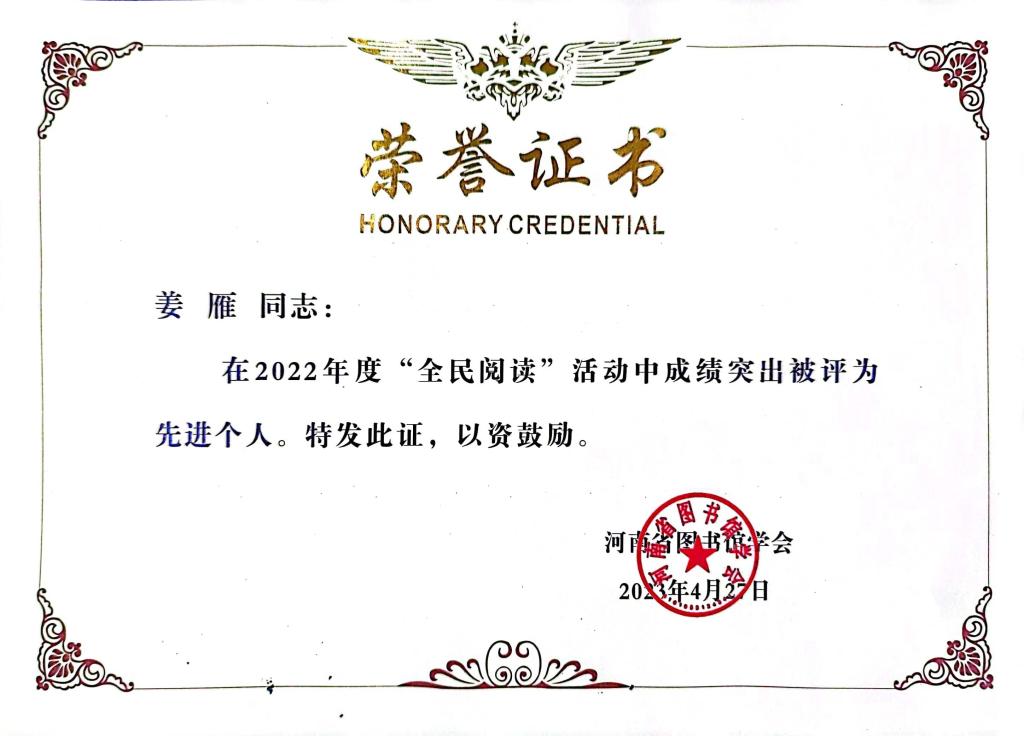 4月27日,河南省图书馆学会第十届二次全体理事会议在郑州召开,大会分别对2021年和2022年全省各级各类图书馆全民阅读活动进行了总结和表彰。beat365在线平台官网图书馆被评为2021年度和2022年度“全民阅读”先进单位,刘钊、姜雁两位老师分别获评2021年度、2022年度“全民阅读”先进个人。