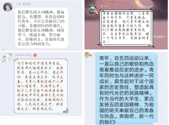 主题团日活动采用线上形式进行,根据统一安排,各班级团支部围绕学习领会习近平总书记五四寄语精神、学习团省委示范团课视频、传达团省委机关及直属单位全体会议及常委会扩大会议精神等进行了卓有成效的学习。在线上学习讨论中同学们纷纷表示:习近平总书记的寄语温暖人心、催人奋进。作为新时代的中国青年,要牢记习近平总书记的嘱托,增强“四个意识”、坚定“四个自信”、做到“两个维护”,坚定理想信念,站稳人民立场,练就过硬本领,投身强国伟业,长存爱国之情、忧国之心、报国之志,一定不辜负党的期望、人民期待、民族所托,不辜负我们这个伟大的时代。