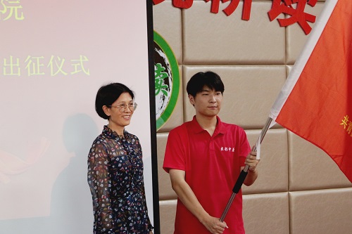 副校长王万玲为本次社会实践活动总队、“出彩中原”团队、“青蔓乡间”团队及小分队代表授旗并进行了讲话。在讲话中她表示,今年是中国共产党成立100周年,广大师生要在社会课堂中受教育、长才干、作贡献,在观察实践中学党史、强信念、跟党走,努力成为担当民族复兴大任的时代新人,以实际行动庆祝中国共产党成立100周年。同时,她对师生们提出了三点希望:一是严格遵守所在地疫情防控工作要求,把疫情常态化防控贯彻始终,同时密切关注天气变化、交通安全、饮食卫生等,根据实际灵活调整实践内容,确保本次社会实践安全有序进行;二是周密部署,突出育人实效,把暑期社会实践作为加强改进大学生思想政治教育、深化爱国主义的重要抓手,紧紧围绕庆祝建党百年主题,聚焦乡村振兴主战场,用双眼见证国家发展,用脚步丈量祖国大地,用实践厚植理想信念,在广袤的实践舞台上加强“四史”的学习和领悟;三是利用好传统媒体和新媒体做好宣传,树标杆、树先进、树典型,及时总结活动经验,力争出特色、出成绩、出成果。最后,她勉励同学们要在实践中不断树立和培养远大的理想信念、不悔的青春追求、敢于创新的时代精神、艰苦奋斗的顽强毅力,肩负起时代的责任与使命,以奋进者、开拓者、奉献者之姿书写无悔的青春篇章。