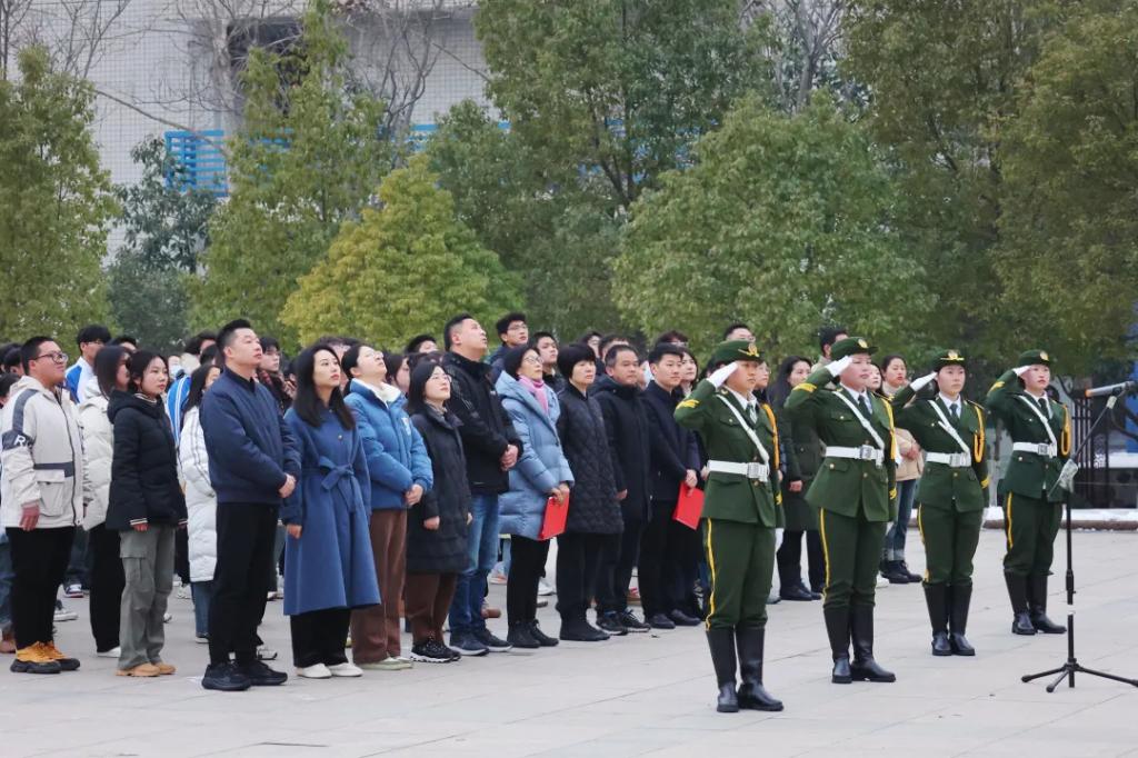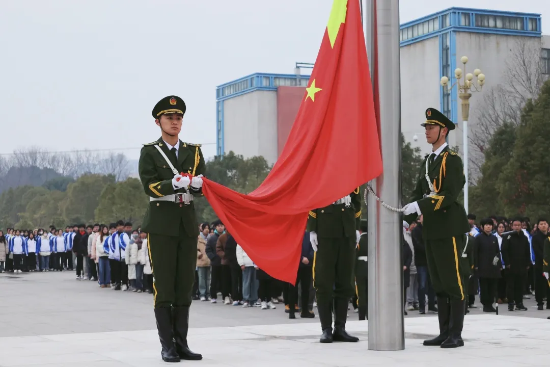早晨七点整,仪式正式开始,校团委国旗护卫队的同学们姿态气宇轩昂,步伐铿锵有力,护送着鲜艳的五星红旗正步走向旗杆。在雄壮国歌声中,全体师生面向国旗肃立致礼,鲜艳的五星红旗徐徐上升,在晨曦中迎风飘扬。