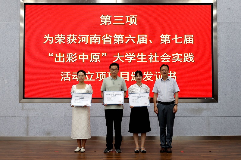 启动仪式上,何涛、简频捷、靳潢为实践团代表授旗,并为第六届、第七届“出彩中原”大学生社会实践活动立项项目颁发证书,社会实践团队员代表管理学院陈小鹏同学和领队教师代表食品科学与工程学院团总支书记易蕾老师作了表态发言。