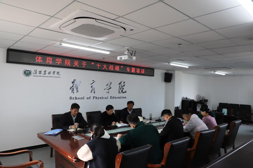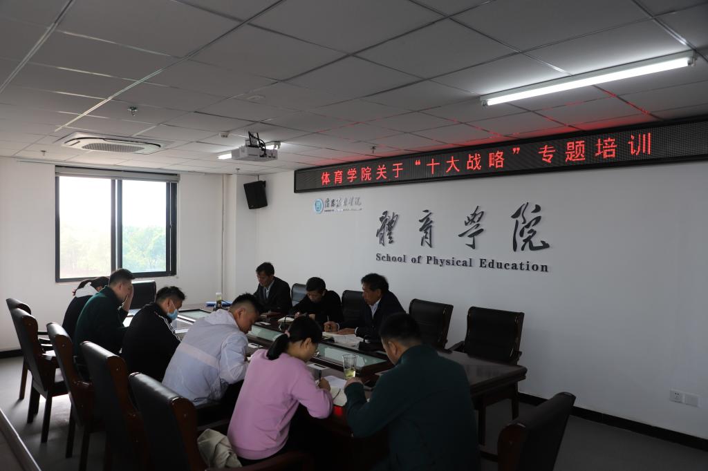 为贯彻落实《中共河南省委教育工作委员会办公室关于组织党员进党校学习“十大战略”的通知》(豫教工委办〔2022〕7号)要求,结合学校“能力作风建设年”活动安排及党员教育培训工作实际,4月18日上午,体育学院组织党员干部开展“十大战略”专题培训。