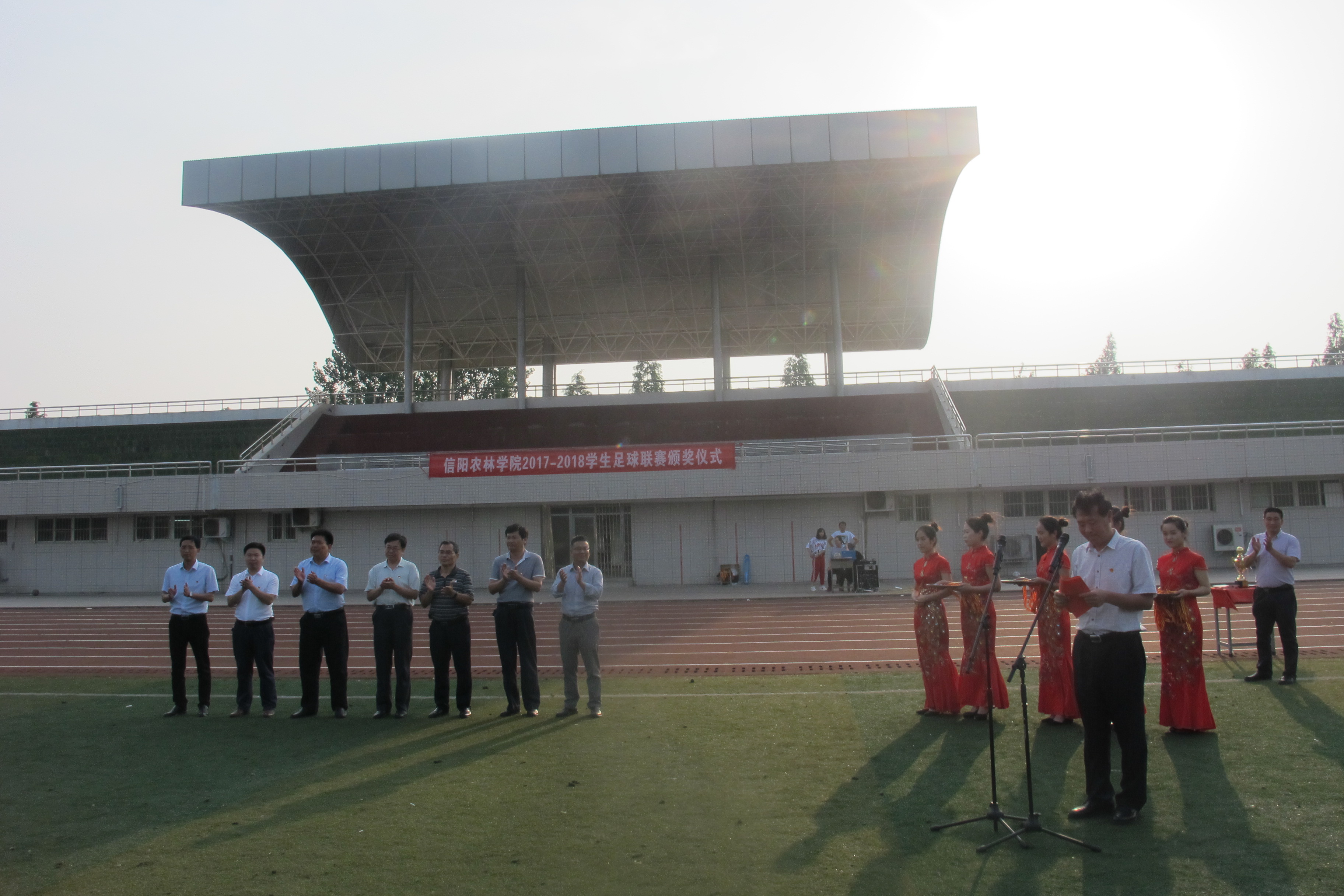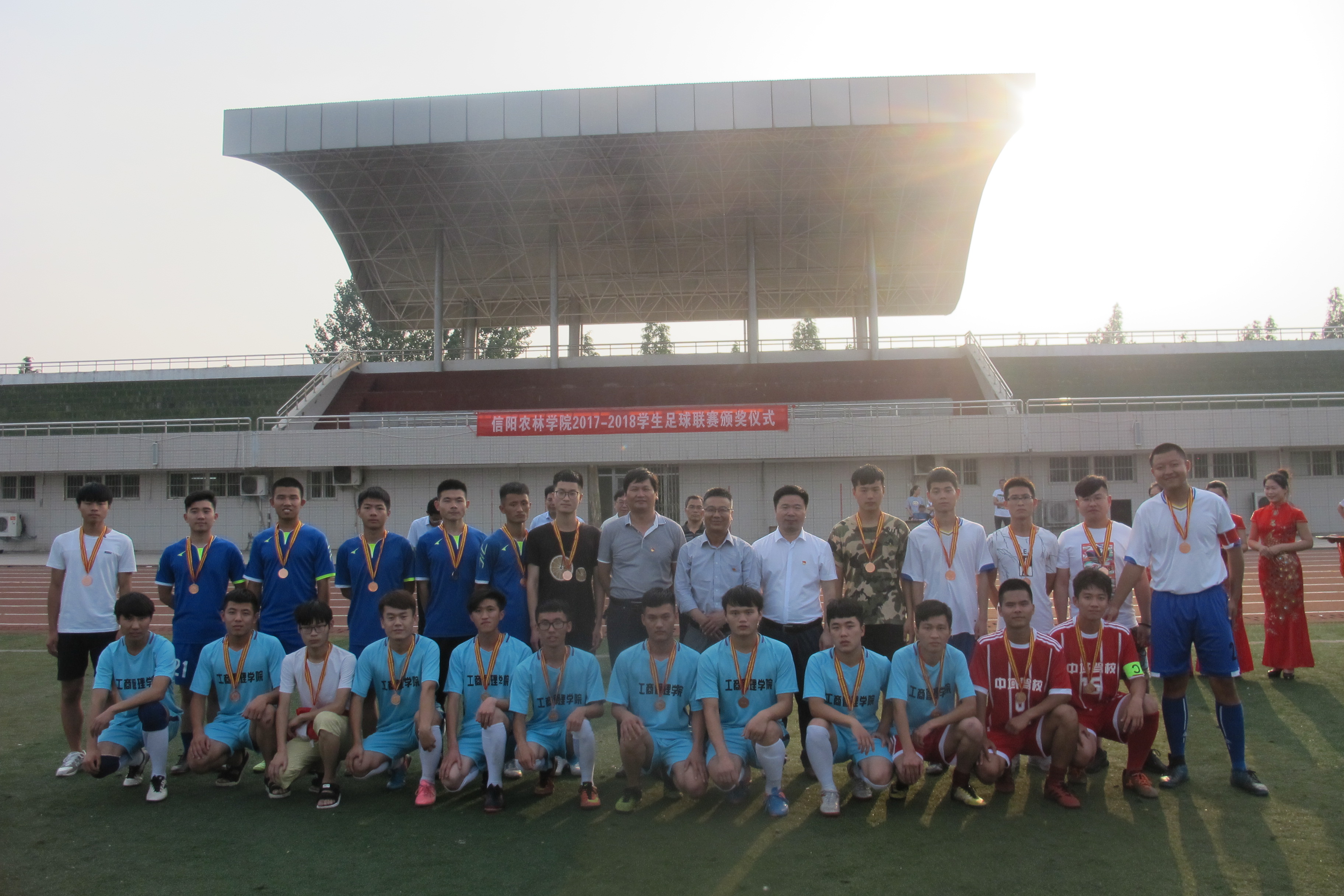 beat365在线平台官网2017-2018年学生足球联赛于6月5日下午17:30在田径场举行了隆重的颁奖仪式。校党委副书记刘光生、副校长王庆兵、黄松,水产学院院长杨东辉、工商管理学院党总支书记王广铭、农学院党总支书记雷振山,信息工程学院副院长李友国、体育教学部副主任郭德兵参加了颁奖仪式,并为获奖代表队运动员颁发奖牌和奖杯。颁奖仪式由体育教学部主任李俊主持。