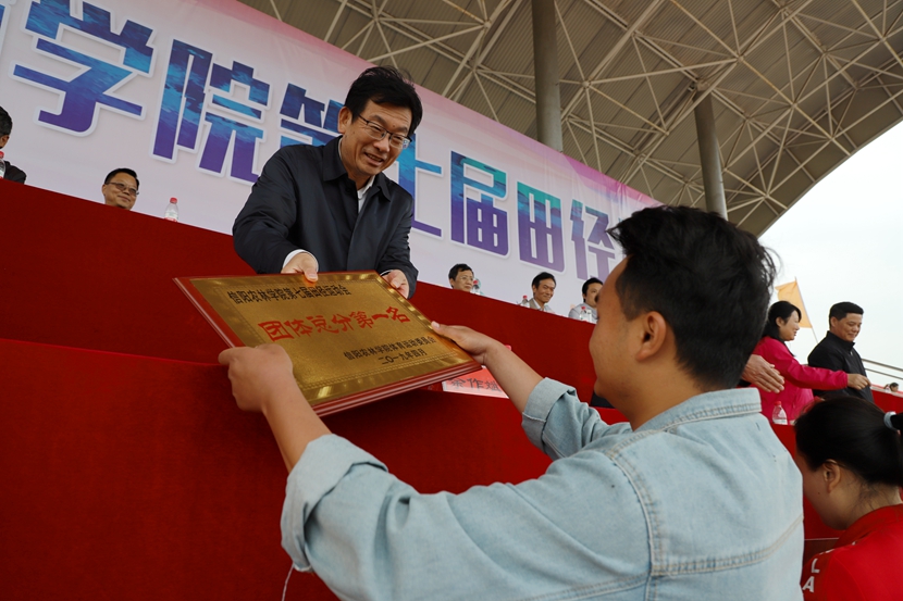 闭幕式上,扶庆代表学校向取得佳绩的运动员和代表队表示热烈祝贺,向运动会组委会和全体裁判员、教练员、青年志愿者及其他工作服务人员表示衷心感谢。他指出,本届运动会产生39项冠军,有3项6人次刷新学校田径运动会纪录,有 55人获得个人单项奖,12个参赛队获得团体总分名次,还涌现出一批体育道德风尚代表队和精神文明先进个人,充分展现了全校师生奋发图强、团结拼搏的精神风貌,反映了beat365在线平台官网教育教学水平提高、体育事业蓬勃发展的良好局面,圆满实现了体育成绩与精神文明双丰收的预期目标。他希望,全体师生将本次运动会中焕发出来的勇于争先、顽强拼搏、团结协作,顾全大局的精神带到日常的学习和工作中去,广大师生要争做社会主义核心价值观的坚定信仰者、积极传播者、模范践行者。不忘初心、牢记使命,继续发扬 “更高、更快、更强”的体育精神,为创造学校新的辉煌而努力奋斗。