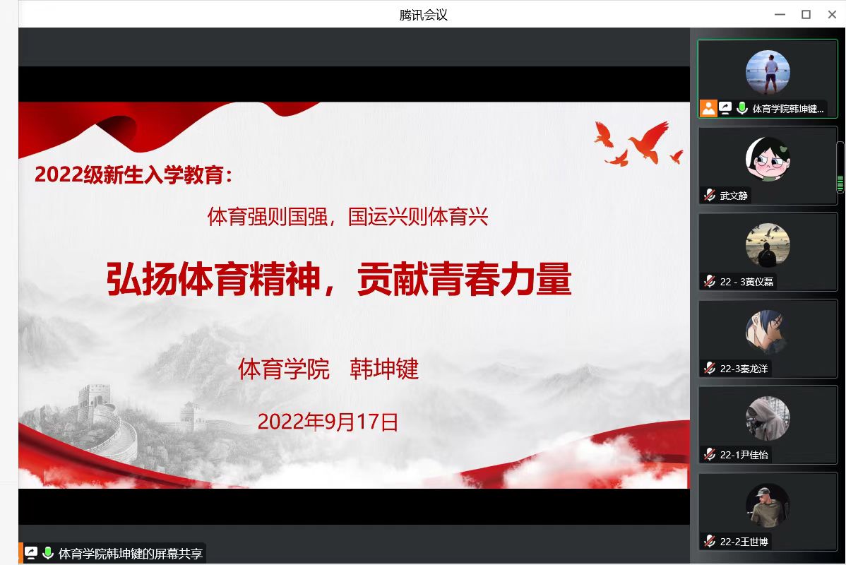 为全面提高学生的身体素质和健康水平,加快推进体育强国建设,9月17日上午,体育学院采用线上视频的形式,开展了“弘扬体育精神,贡献青春力量”主题专业教育,体育学院韩坤键老师主讲,休闲体育专业2022级全体新生参加。