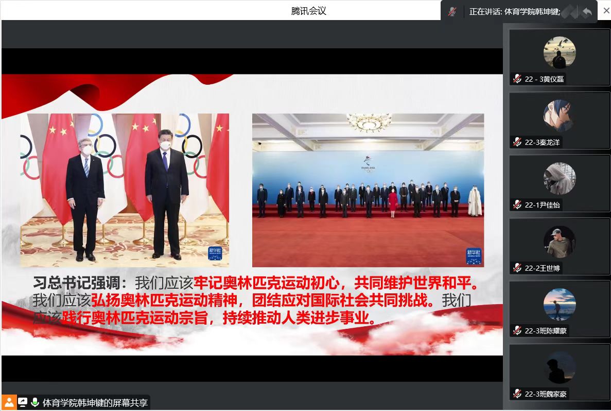 会上,韩坤键老师首先提问学生对体育的理解,指出体育的本质是受社会文化的影响,为社会、政治、经济发展服务的一种特殊的文化运动。随后通过PPT向大家展示了冬奥健儿们飒爽的英姿,并从爱国精神、拼搏精神、团结精神三方面阐述了体育精神的内涵,强调体育精神是宝贵的精神财富,教育青年学生要不忘初心,用艰苦奋斗、自强不息、奋力拼搏的实际行动,努力建设社会主义现代化强国,实现中华民族伟大复兴。