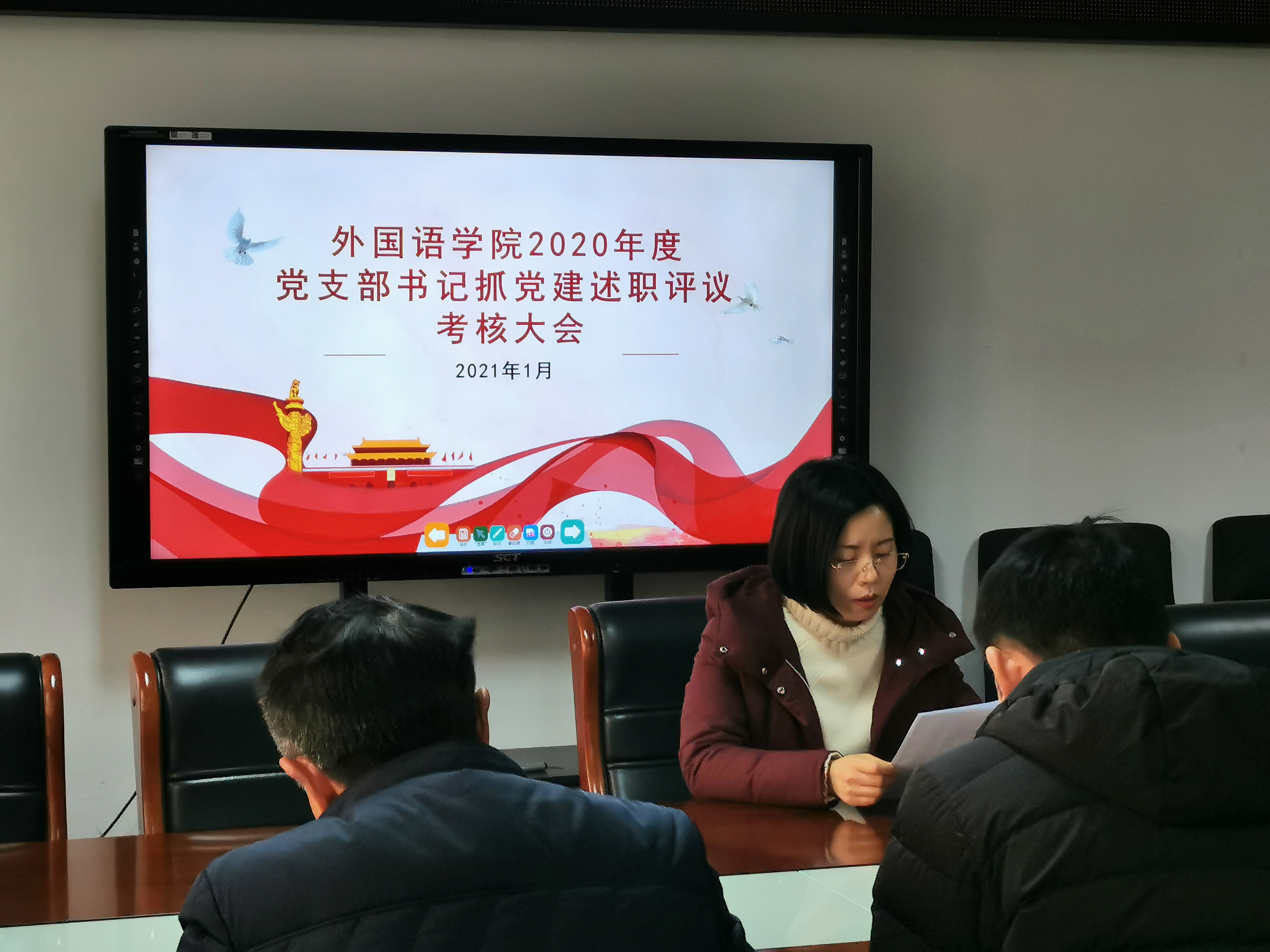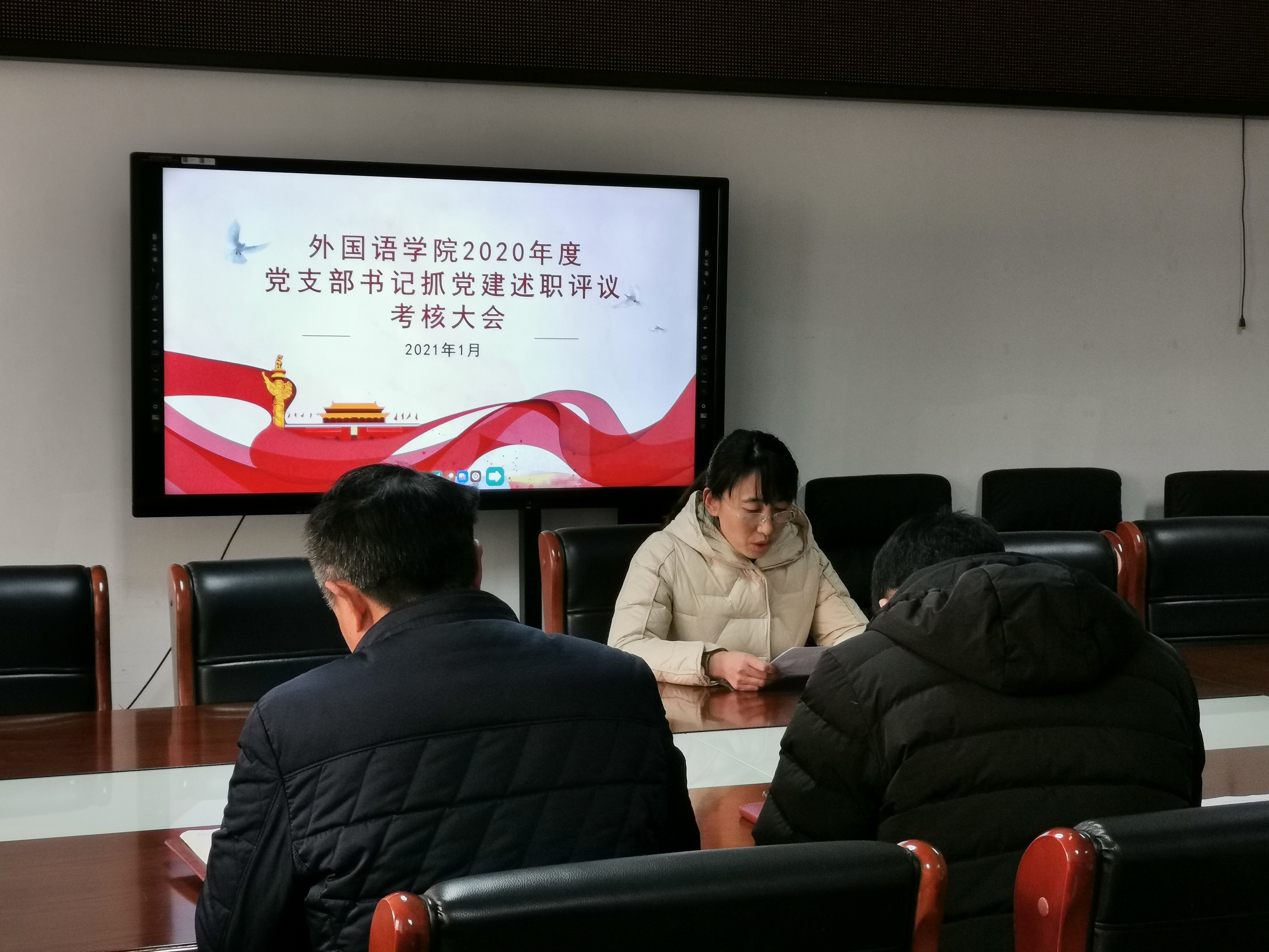 为深入学习贯彻习近平新时代中国特色社会主义思想和党的十九大精神,进一步落实管党治党政治责任,切实提高党建工作质量,2021年1月6日下午,外国语学院党总支在行政楼803召开2020年度党支部书记抓党建述职评议考核大会。院党总支书记张志强、副书记吴宏、各支部书记及支部党员代表参加了此次大会。
