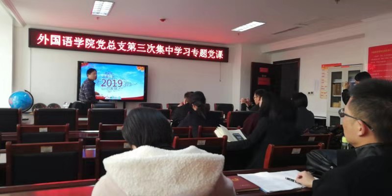 2019年11月23日,外国语学院党总支书记张志强在行政楼803为全体教师党员集体上党课《改天换地70载风华正茂再出发》。