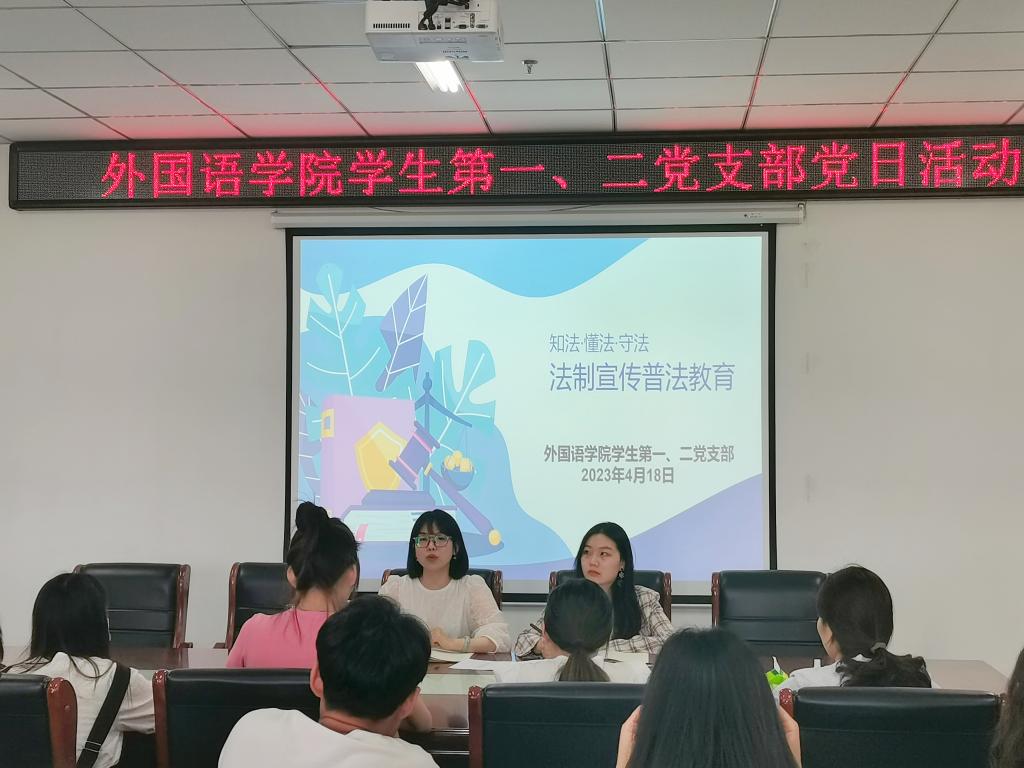 2023年4月18日,外国语学院学生第一、第二党支部在文学艺术楼402开展了“法治教育宣传周”主题党日活动。活动由学生第一党支部书记高宇主持,学生第二党支部书记方钰媛、支部全体党员及团总支学生会优秀团员代表参加。