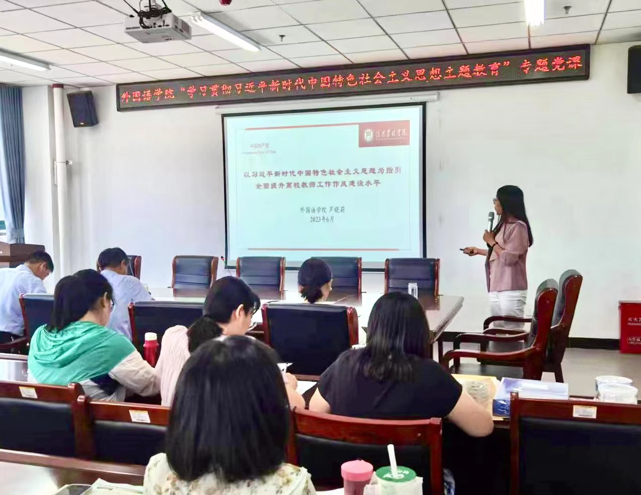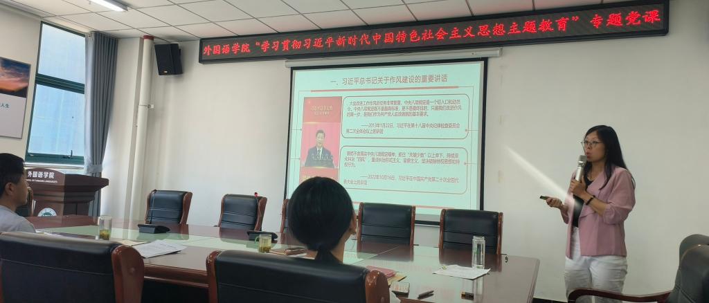 2023613日下午330,外国语学院在文学艺术中心402会议室开展学习贯彻习近平新时代中国特色社会主义思想主题教育第三期专题党课——“以习近平新时代中国特色社会主义思想为指引 全面提升高校教师工作作风建设水平,党课由副院长芦晓莉主讲,学院全体教职工参会。