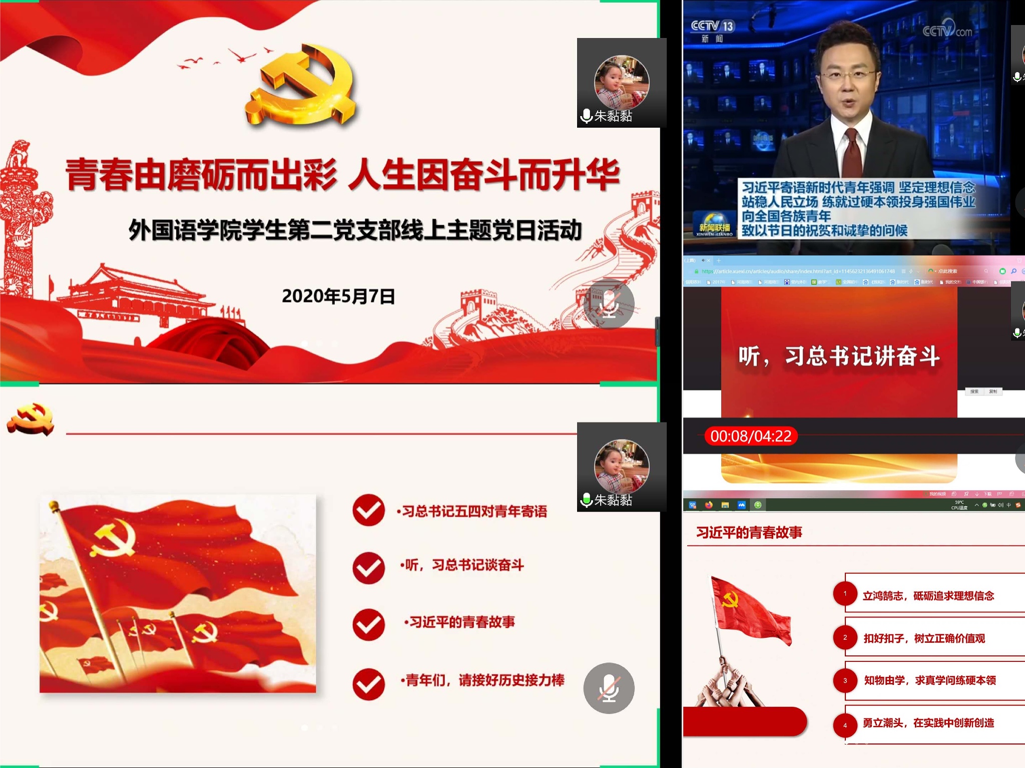 为深入学习习近平总书记五四寄语精神,号召广大青年党员努力奋斗,积极投身社会主义建设事业之中,202057日晚,外国语学院学生第二党支部开展以“青春由磨砺而出彩 人生因奋斗而升华”线上主题党日活动,活动由党支部书记朱俊梵主持,支部全体党员参会。