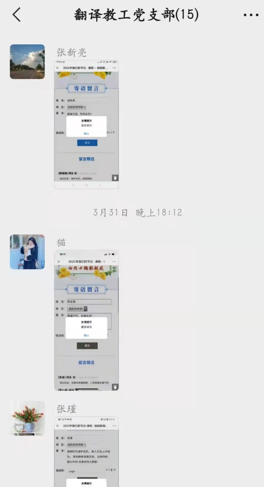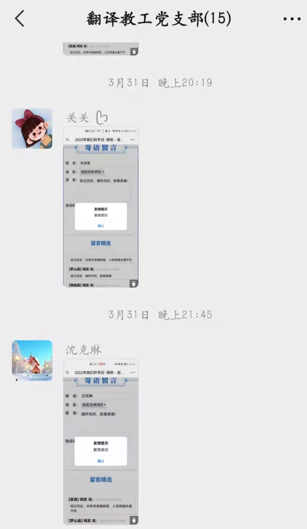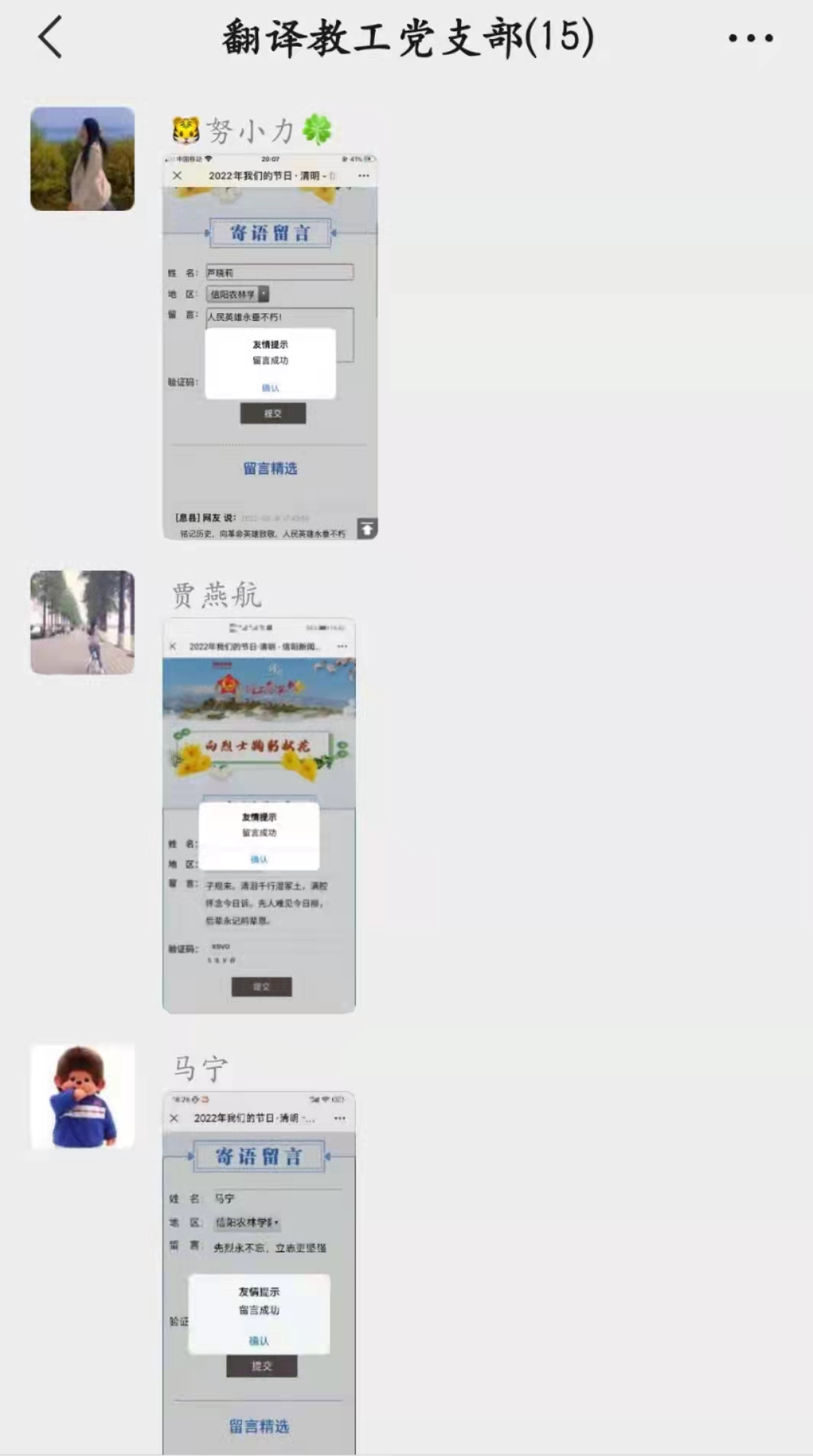 清明节即将到来之际,翻译教工党支部开展了“清明寄哀思,深情悼英烈”主题党日活动。老师们通过线上向先烈鞠躬献花、抒写感言寄语等方式,让清明祭扫活动重于心胜于形。
