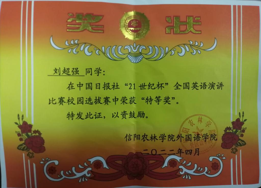 2022年3月,我院动员学生参加中国日报社“21世纪杯”英语演讲比赛,共有36名同学报名。在院领导的关心下,在我院教师的精心指导下,学生经过一个多月的认真准备,按照要求提交了三分钟的主题演讲稿和演讲视频。经过五名评委的匿名打分,评出特等奖1名,一等奖6名,二等奖11名,三等奖18名。其中,刘超强作为特等奖的获得者,将代表beat365在线平台官网参加中国日报社“21世纪杯”英语演讲比赛河南省赛。