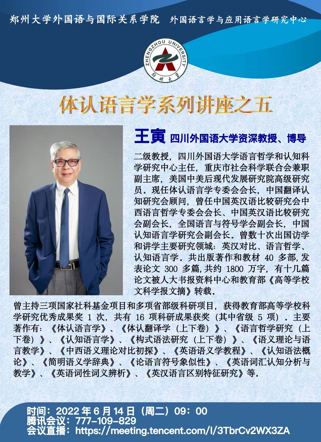 2022年6月14日上午9点,外国语学院《英语词汇学》课程专任教师芦晓莉老师组织20级翻译专业学生线上聆听了四川外国语大学王寅教授基于“体认语言学”对英语词汇学习和教学展开的学术报告。