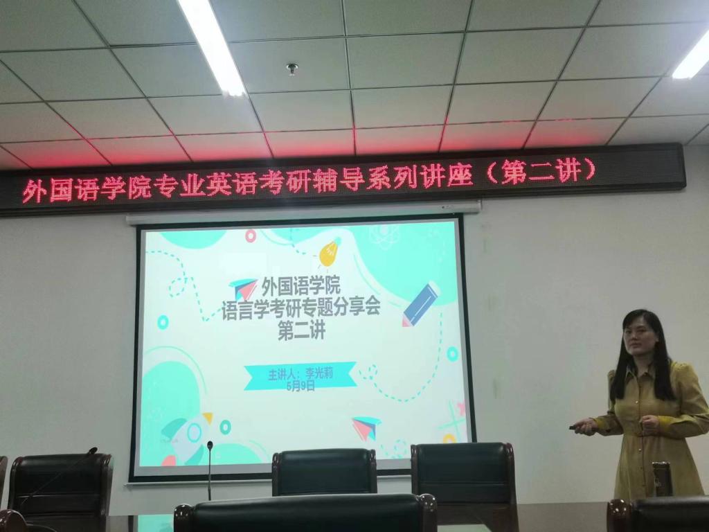 2023年5月9日19:00,外国语学院在文学艺术楼402举办了专业英语考研辅导系列讲座第二讲——语言学专业考研的指导讲座。本次讲座由外国语学院专任教师李光莉主讲,学院20级商务英语专业和翻译专业志愿考研的学生参加了本次讲座。